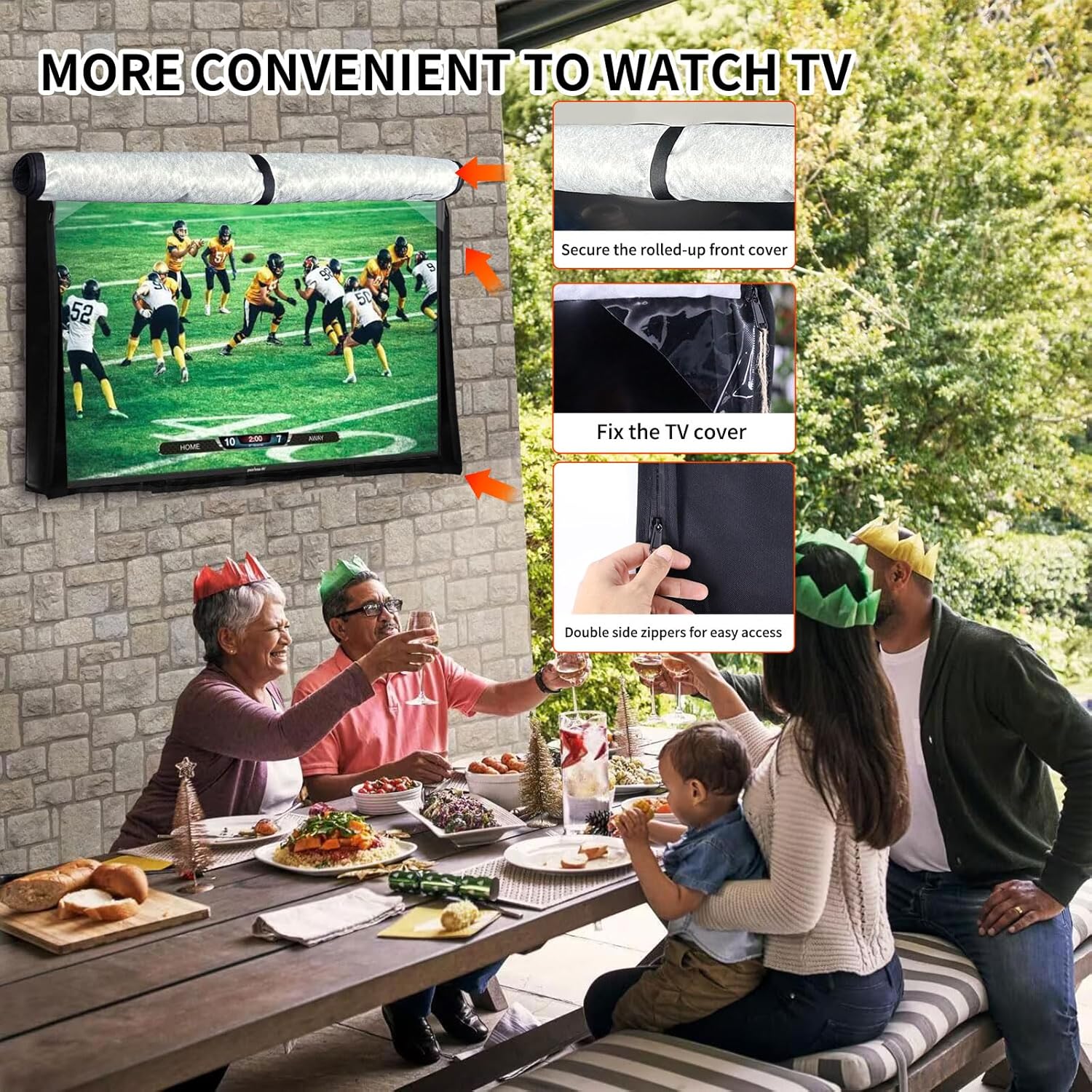 【Complete Waterproofing Features】To protect the TV from wet environments, the TV cover is equipped with waterproof zippers on both sides. The bottom and sides are closed and waterproof with Velcro. This design effectively blocks rain and water splashes, ensuring a dry environment for the TV without any damage.