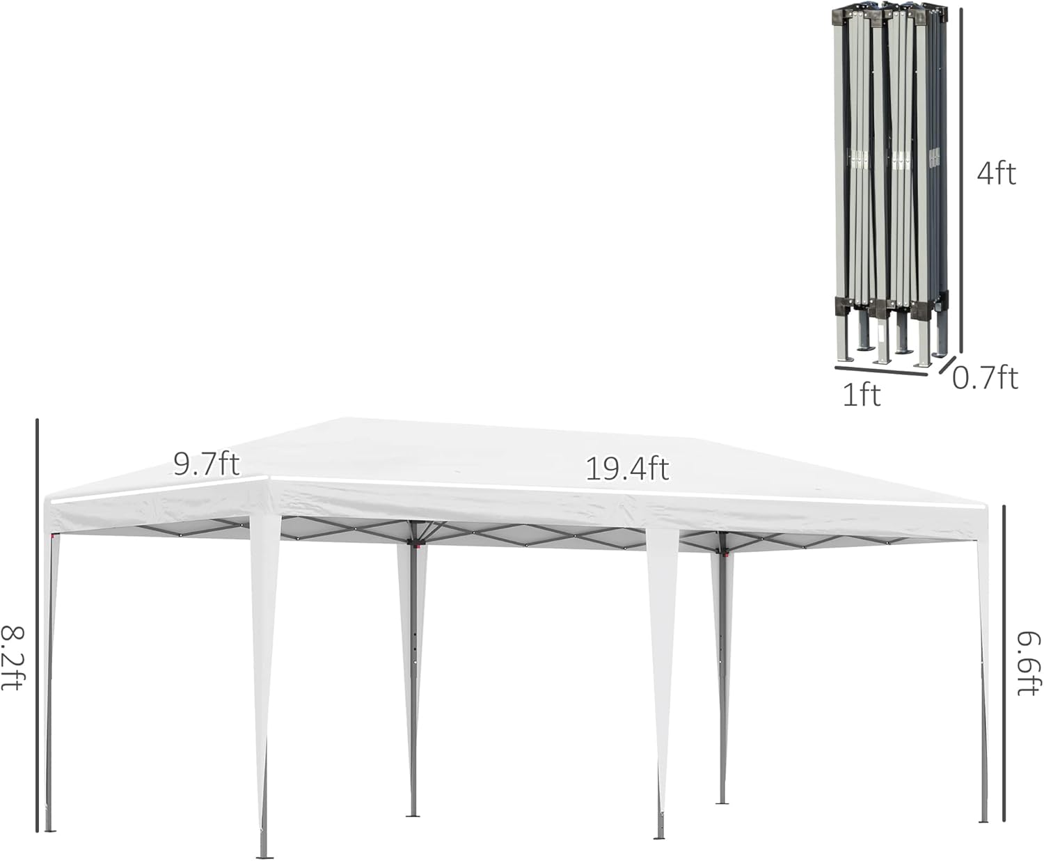 Instant Canopy Info: Overall Dimensions: 19.2′ L x 9.7′ W. Side Height: 6.4′ H. Peak Height: 8.7′ H. Folded Size: 13″ L x 8.75″ W x 45.25″ H. Though it features a folding design, you will need 3-4 people to set it up due to its large size. NOTE: Do not leave up in rain, snow, wind, sleet, or hail.