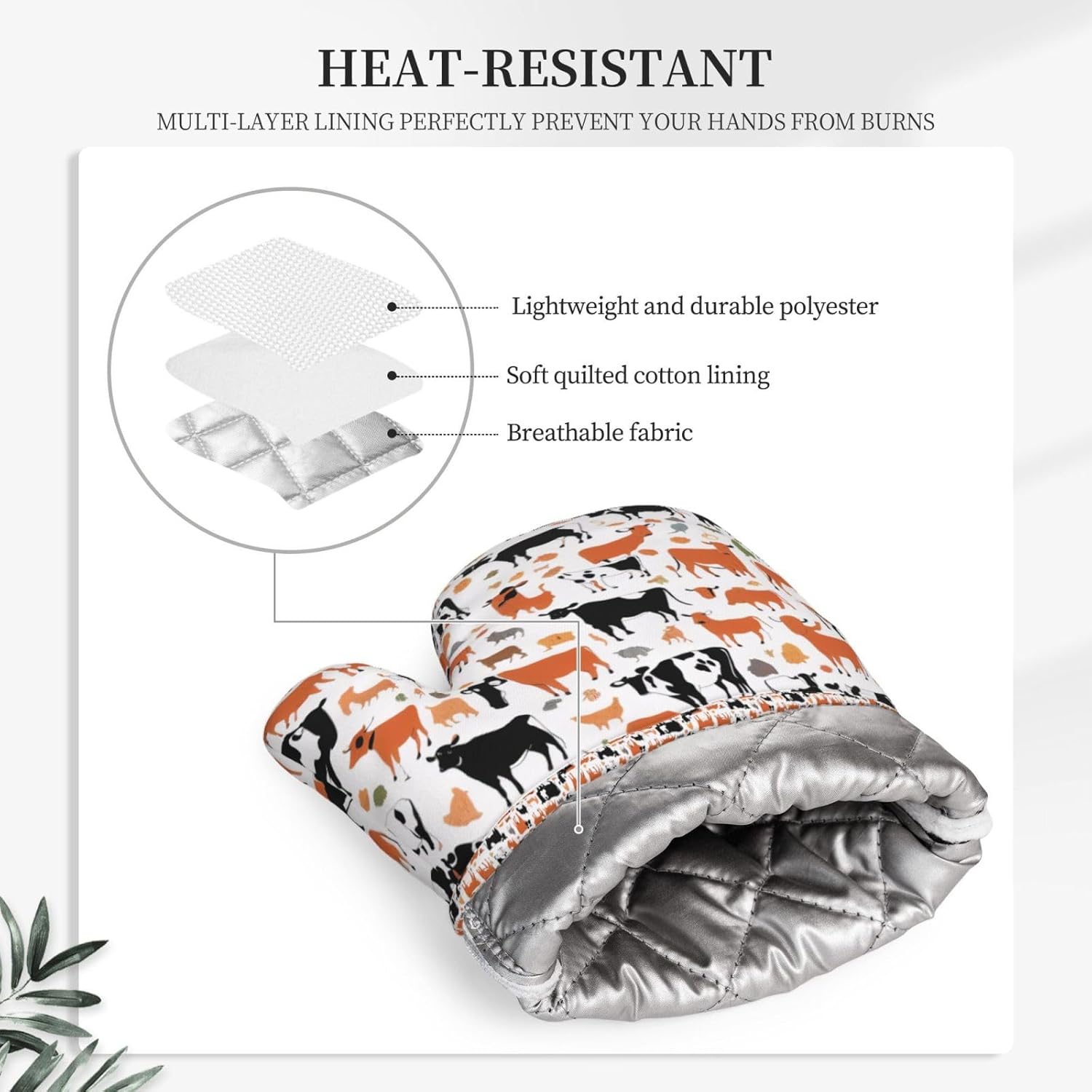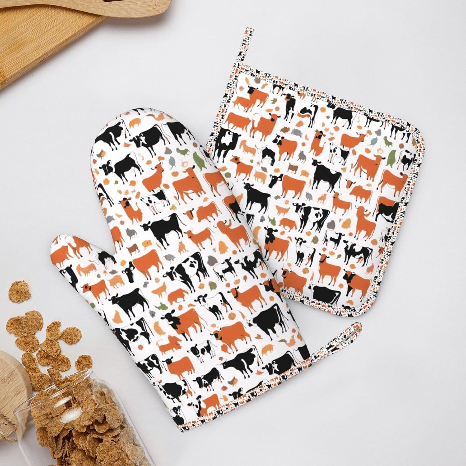 Oven Mitts and Pot Holders for Outdoor Cooking Baking BBQs Heat Resistant Polyester Silicone Oven Gloves Hot Pads, Kitchen Accessories Must Haves List – Cow Print Pattern