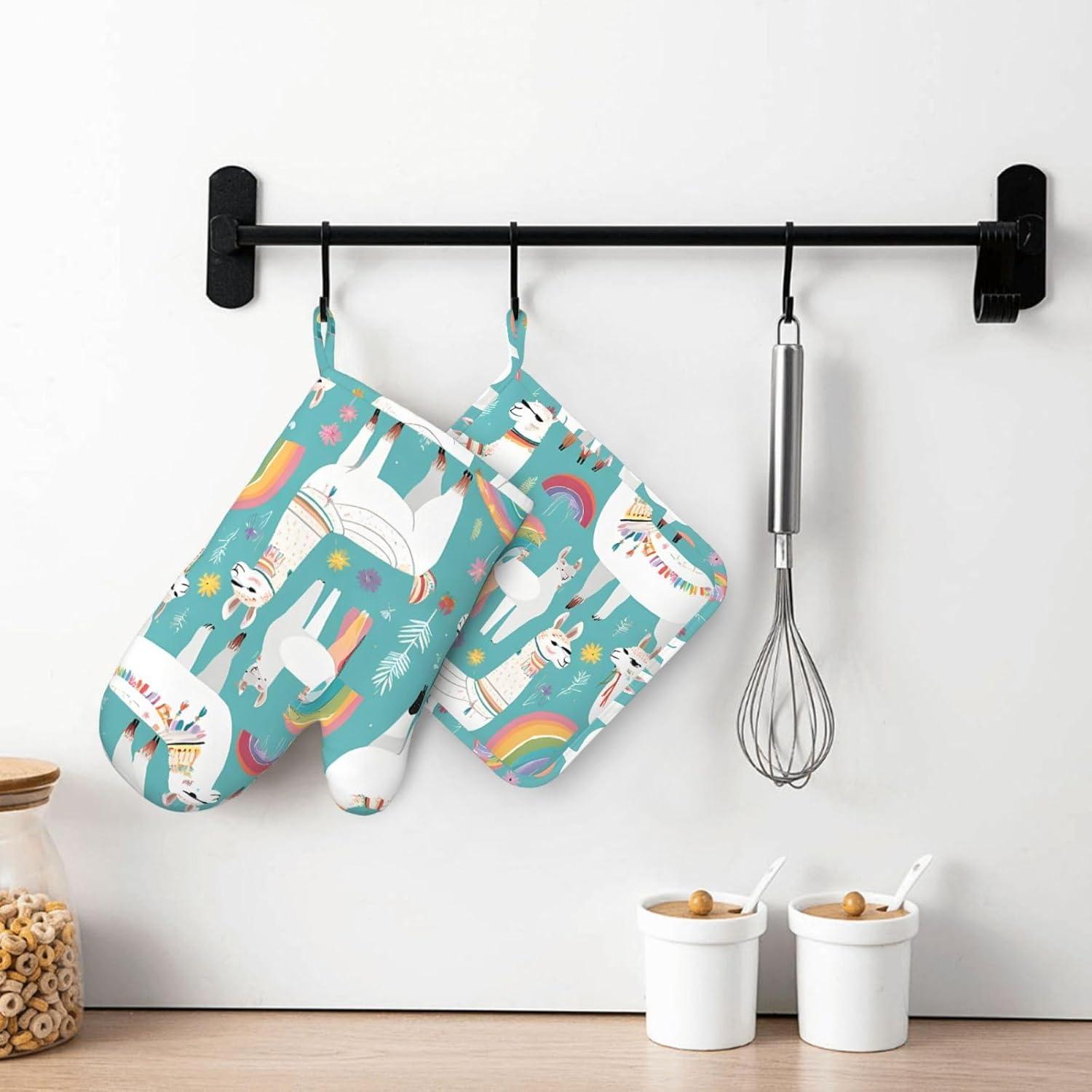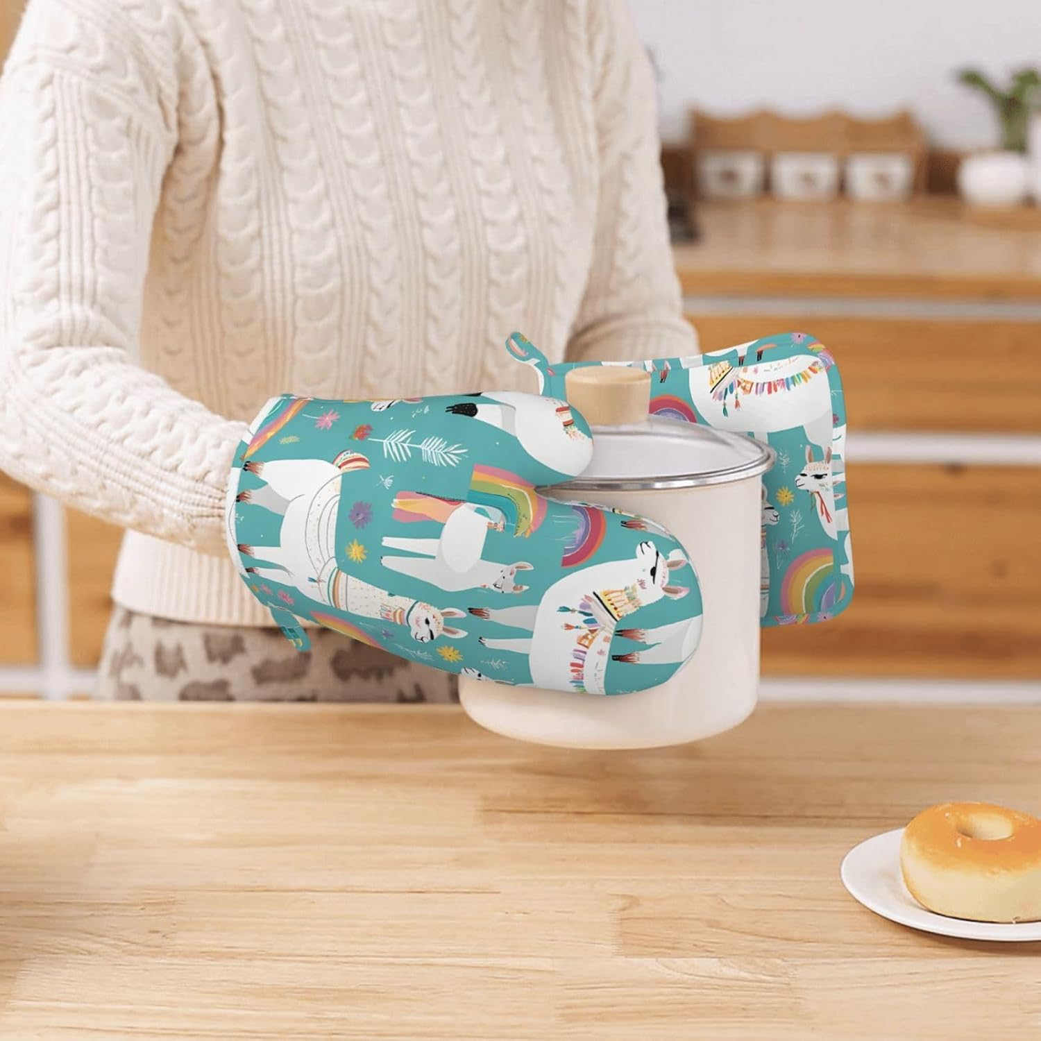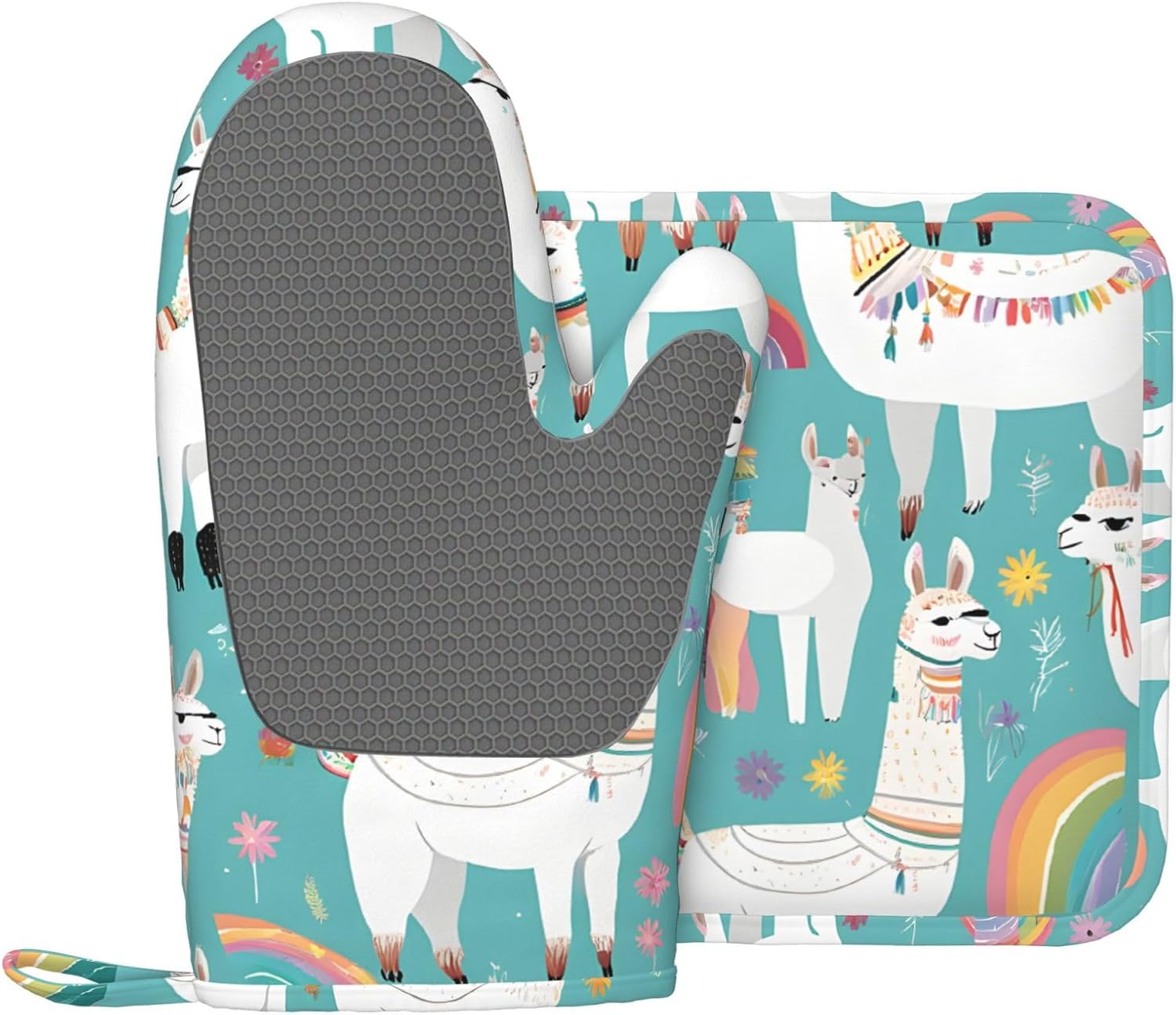 Oven Mitts and Pot Holders for Outdoor Cooking Baking BBQs Heat Resistant Polyester Silicone Oven Gloves Hot Pads, Kitchen Accessories Must Haves List – Cute Llama
