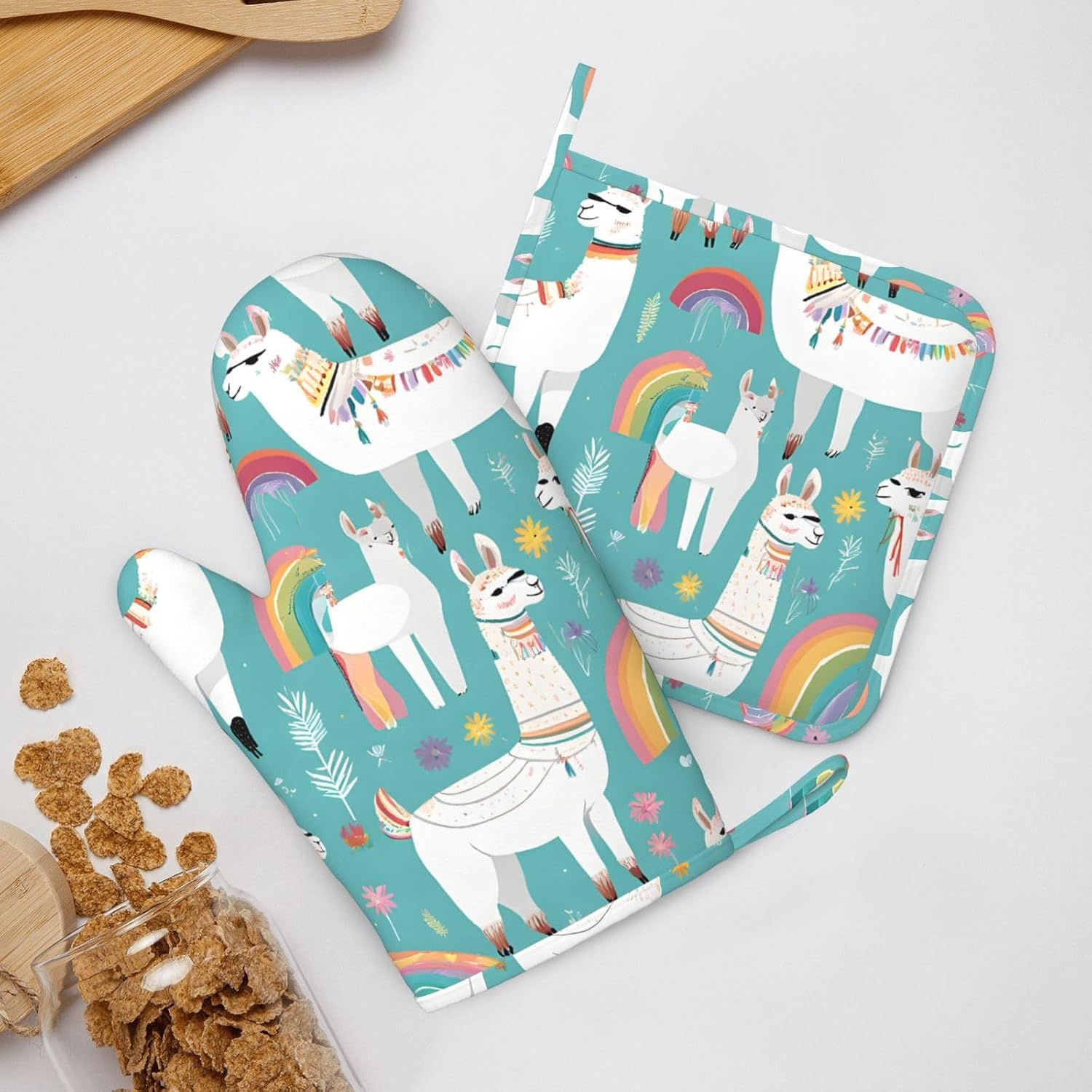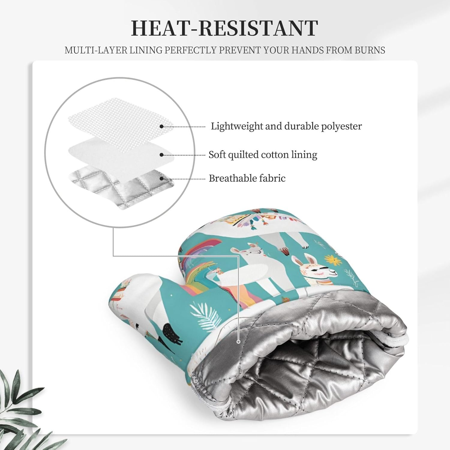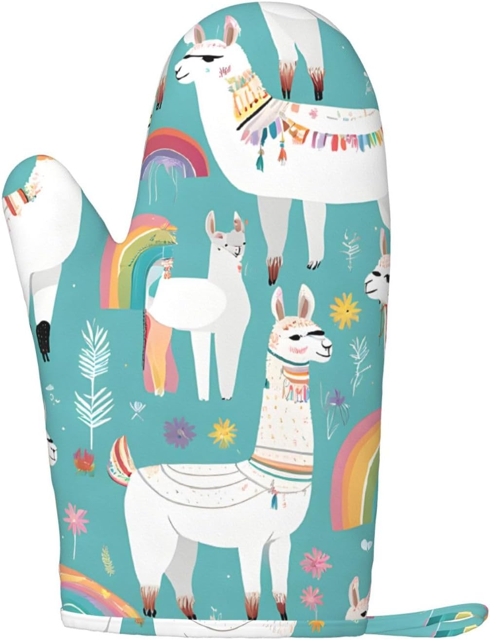 Oven Mitts and Pot Holders for Outdoor Cooking Baking BBQs Heat Resistant Polyester Silicone Oven Gloves Hot Pads, Kitchen Accessories Must Haves List – Cute Llama