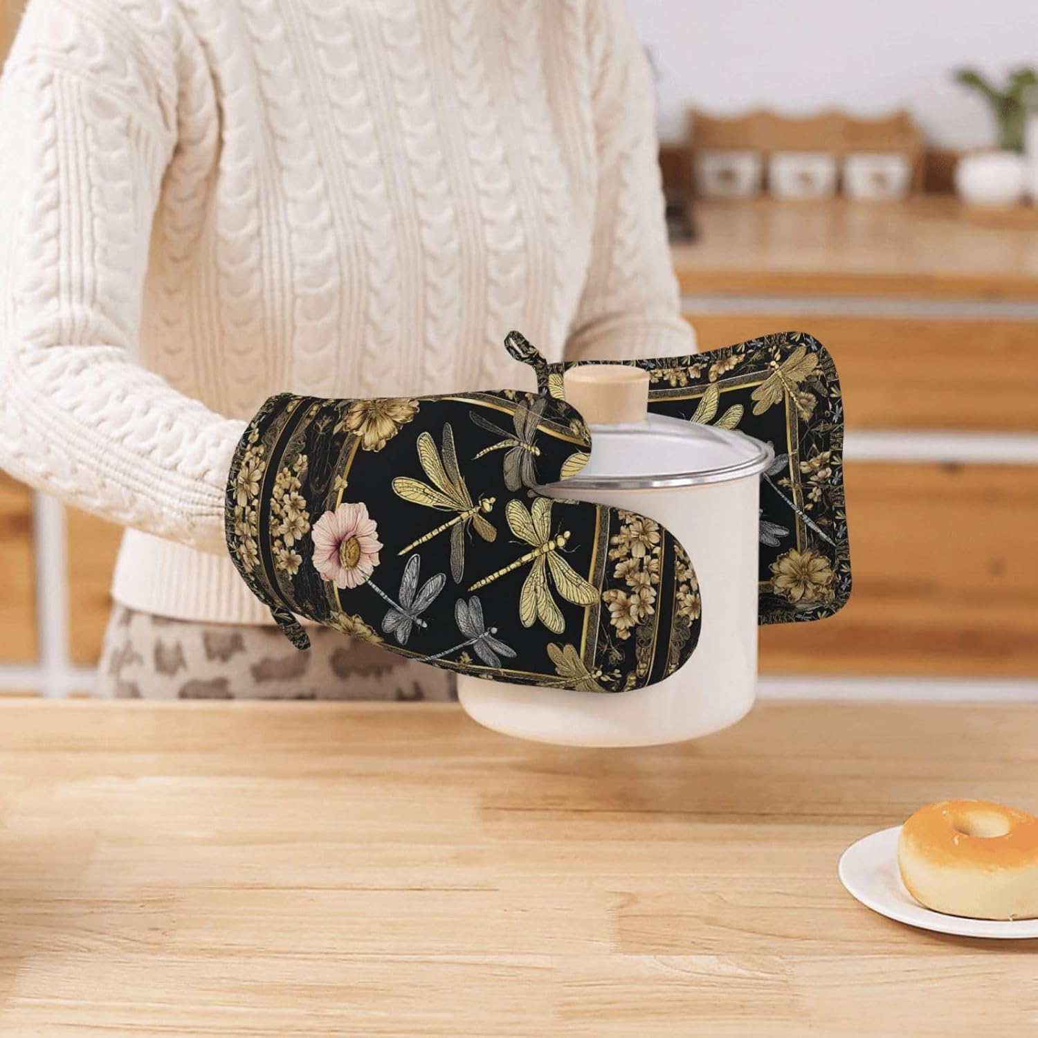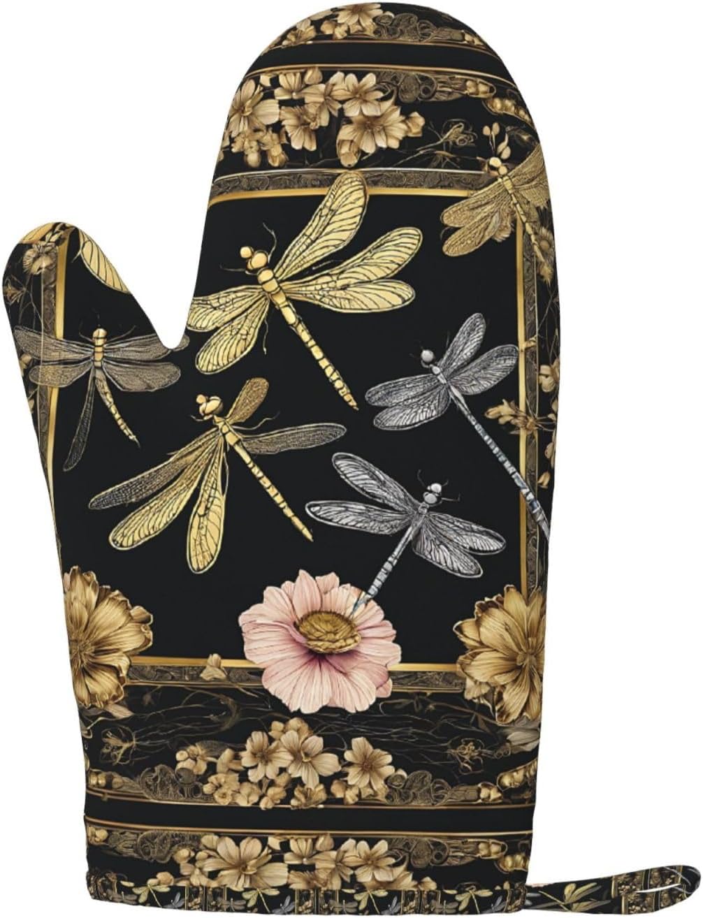 Oven Mitts and Pot Holders for Outdoor Cooking Baking BBQs Heat Resistant Polyester Silicone Oven Gloves Hot Pads, Kitchen Accessories Must Haves List – Dragonflies Grey