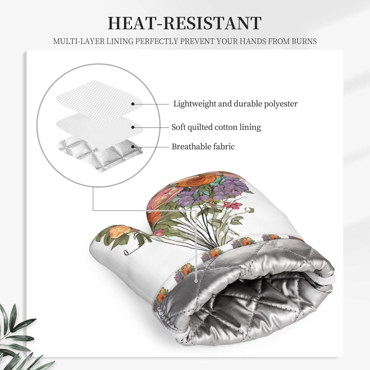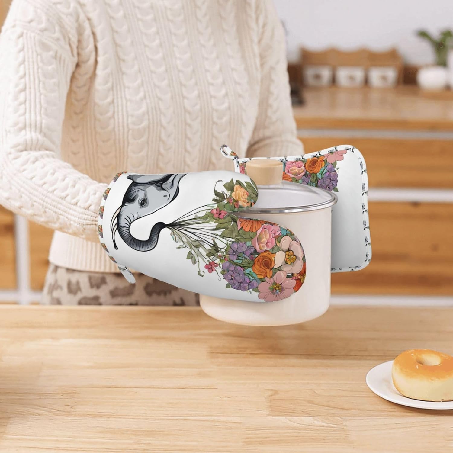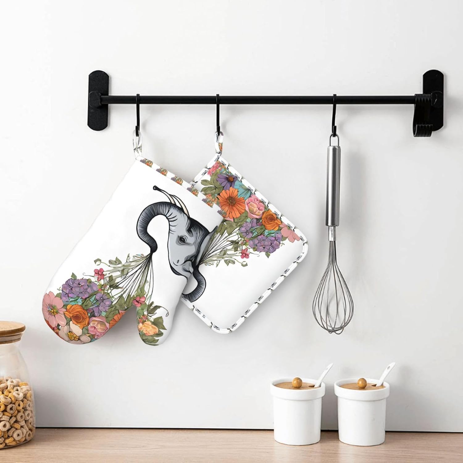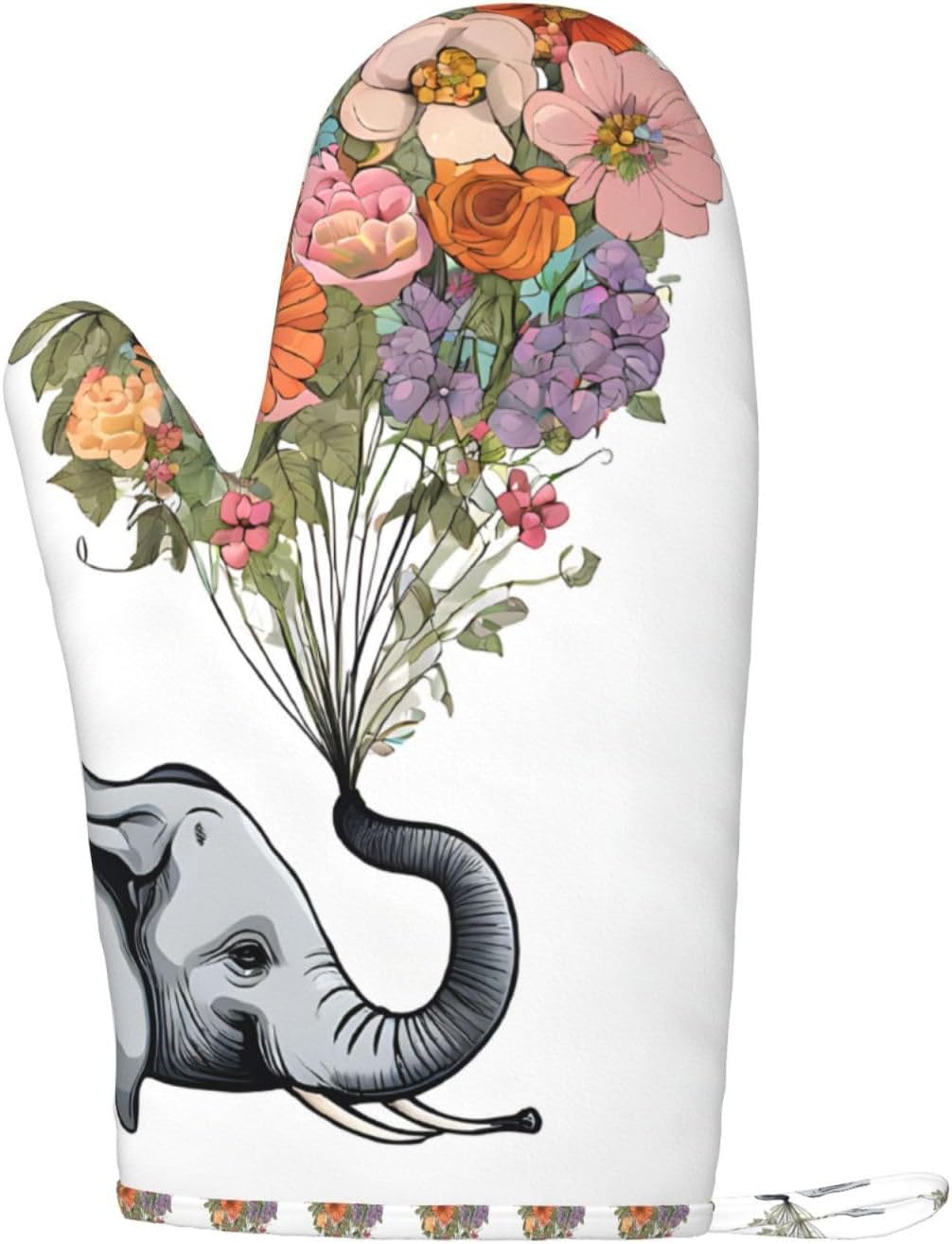 Oven Mitts and Pot Holders for Outdoor Cooking Baking BBQs Heat Resistant Polyester Silicone Oven Gloves Hot Pads, Kitchen Accessories Must Haves List – Elephant with Flower