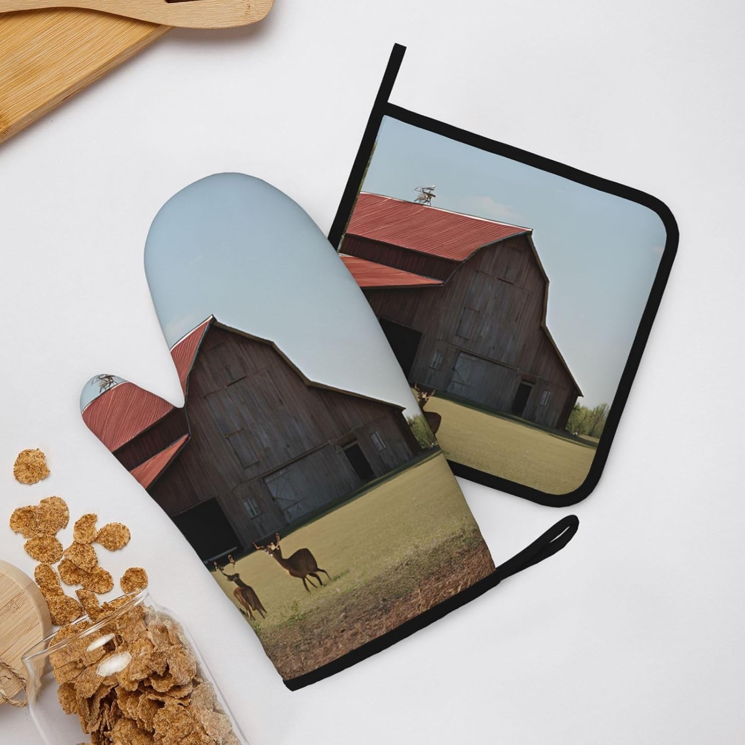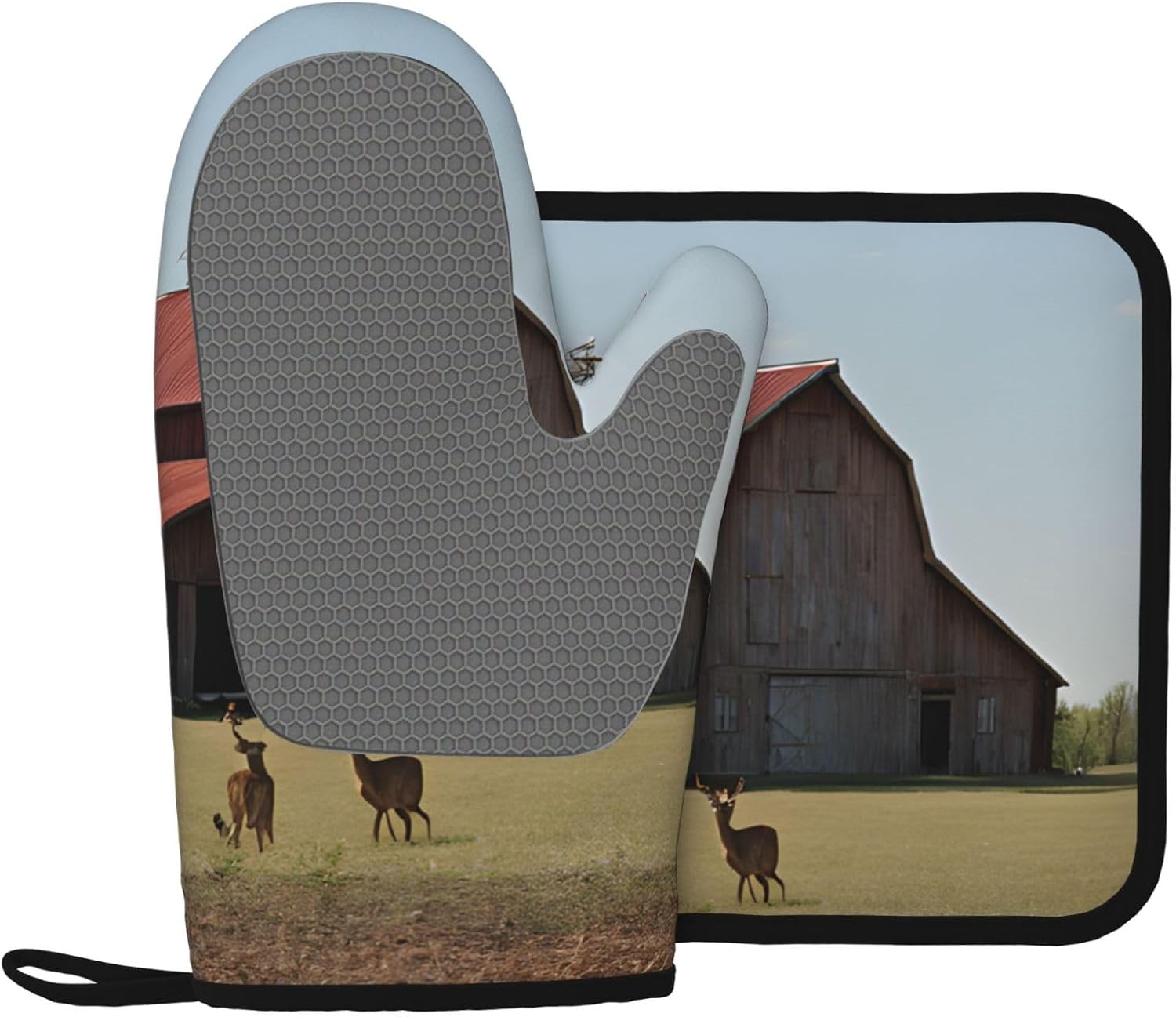 Oven Mitts and Pot Holders for Outdoor Cooking Baking BBQs Heat Resistant Polyester Silicone Oven Gloves Hot Pads, Kitchen Accessories Must Haves List – Farm with Deer