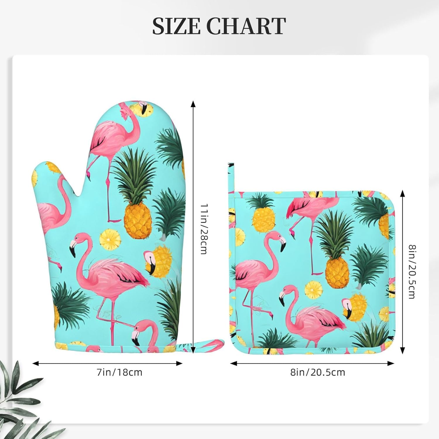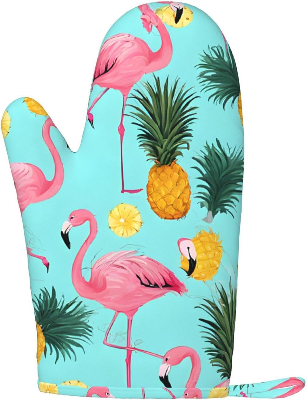 Oven Mitts and Pot Holders for Outdoor Cooking Baking BBQs Heat Resistant Polyester Silicone Oven Gloves Hot Pads, Kitchen Accessories Must Haves List – Flamingo Print
