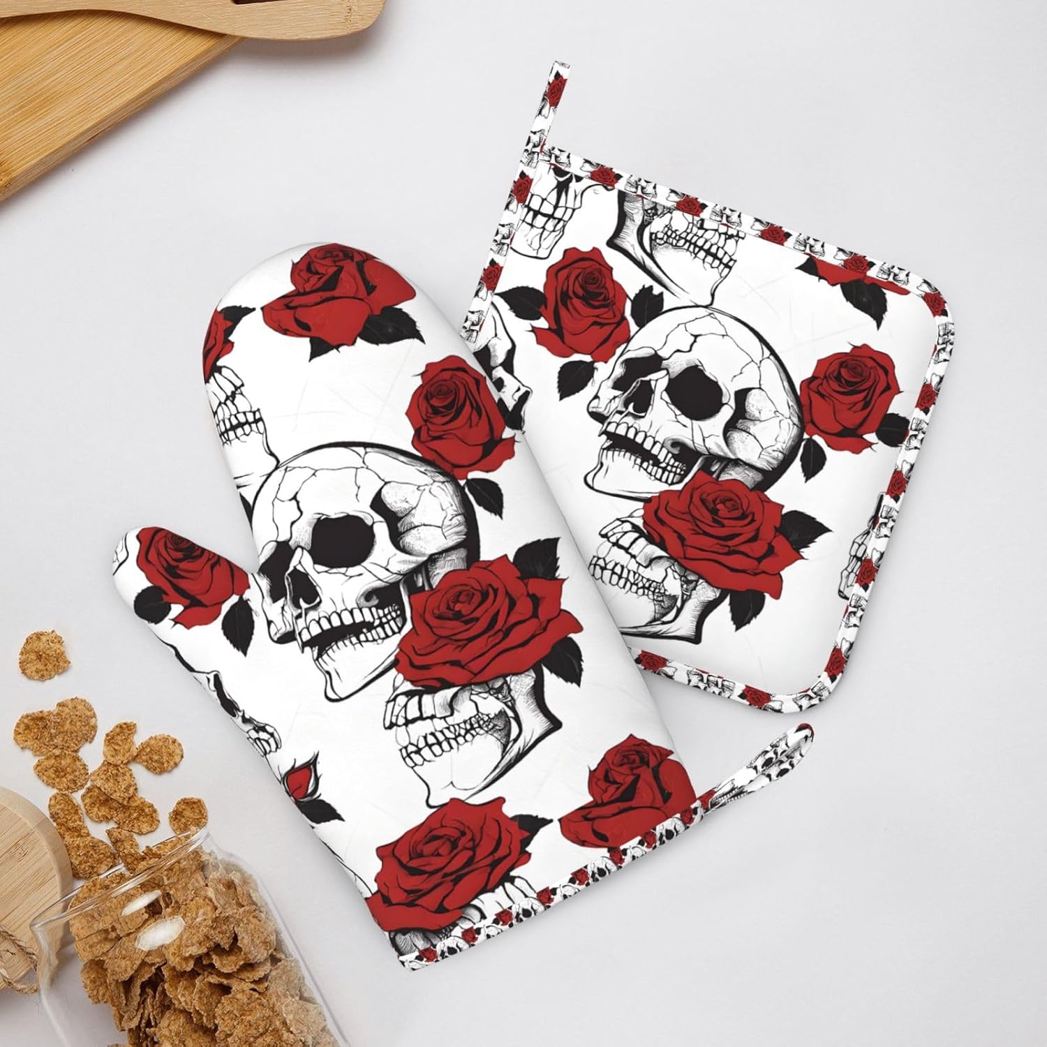 Oven Mitts and Pot Holders for Outdoor Cooking Baking BBQs Heat Resistant Polyester Silicone Oven Gloves Hot Pads, Kitchen Accessories Must Haves List – Floral Skull