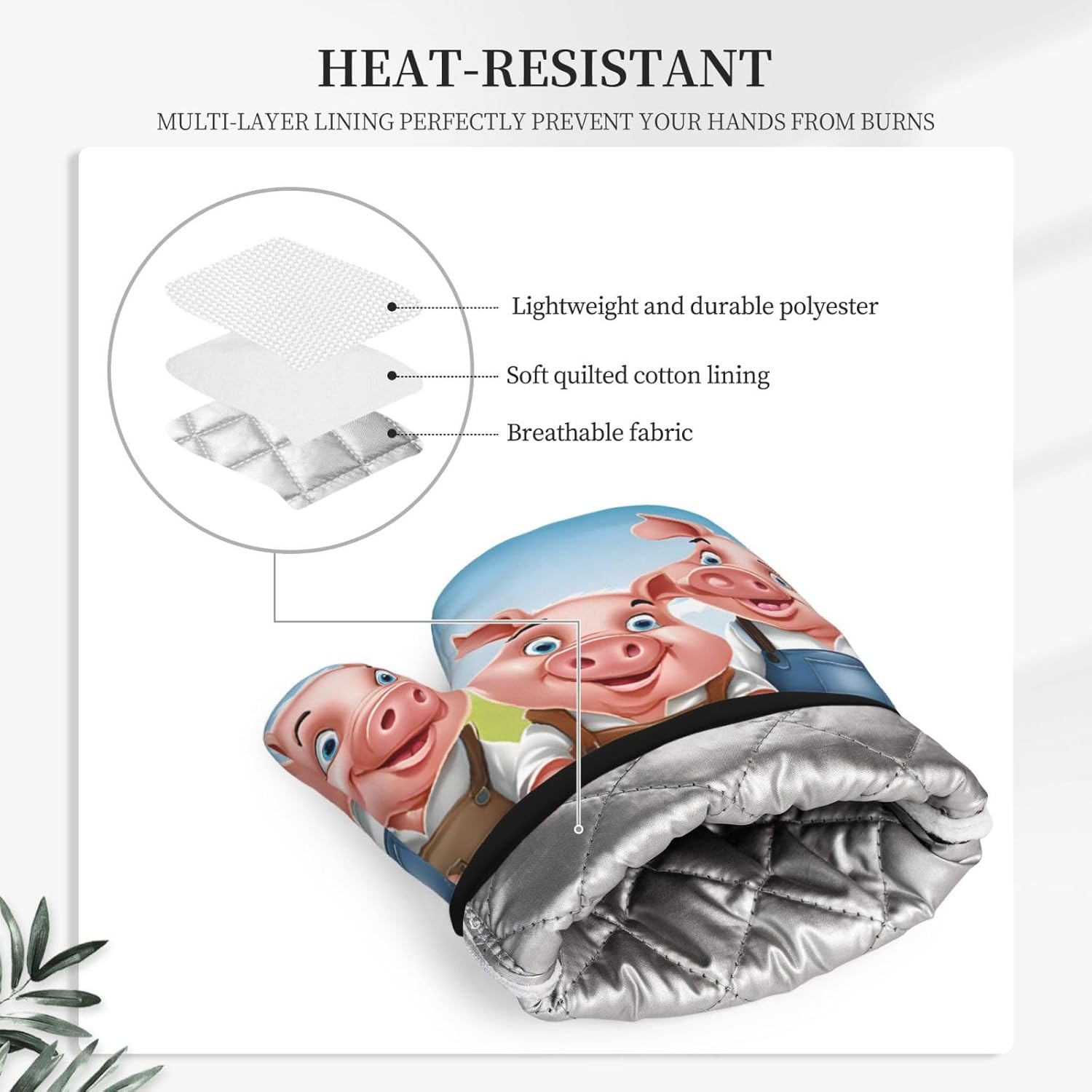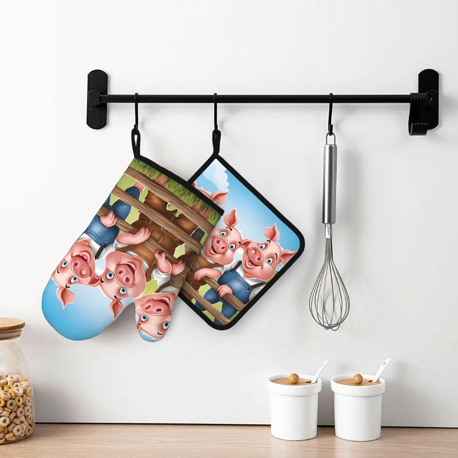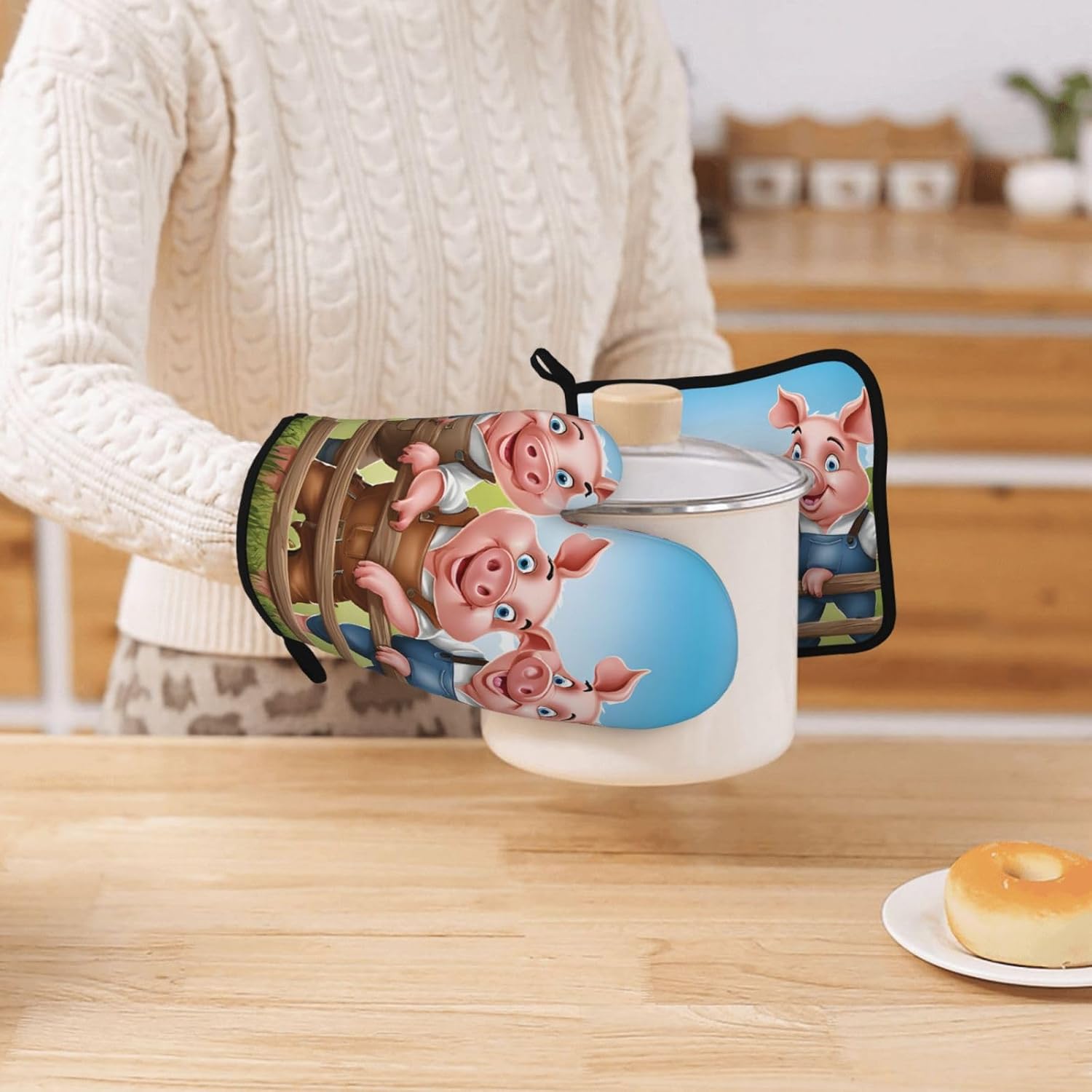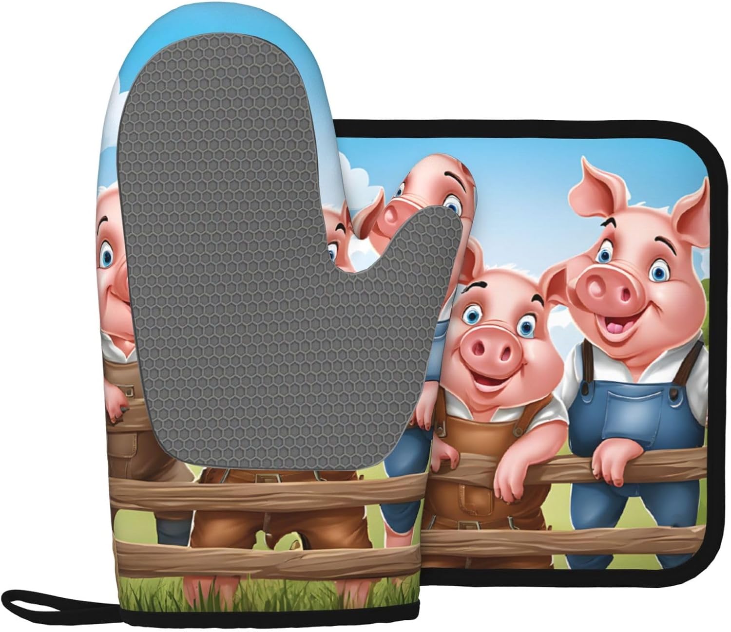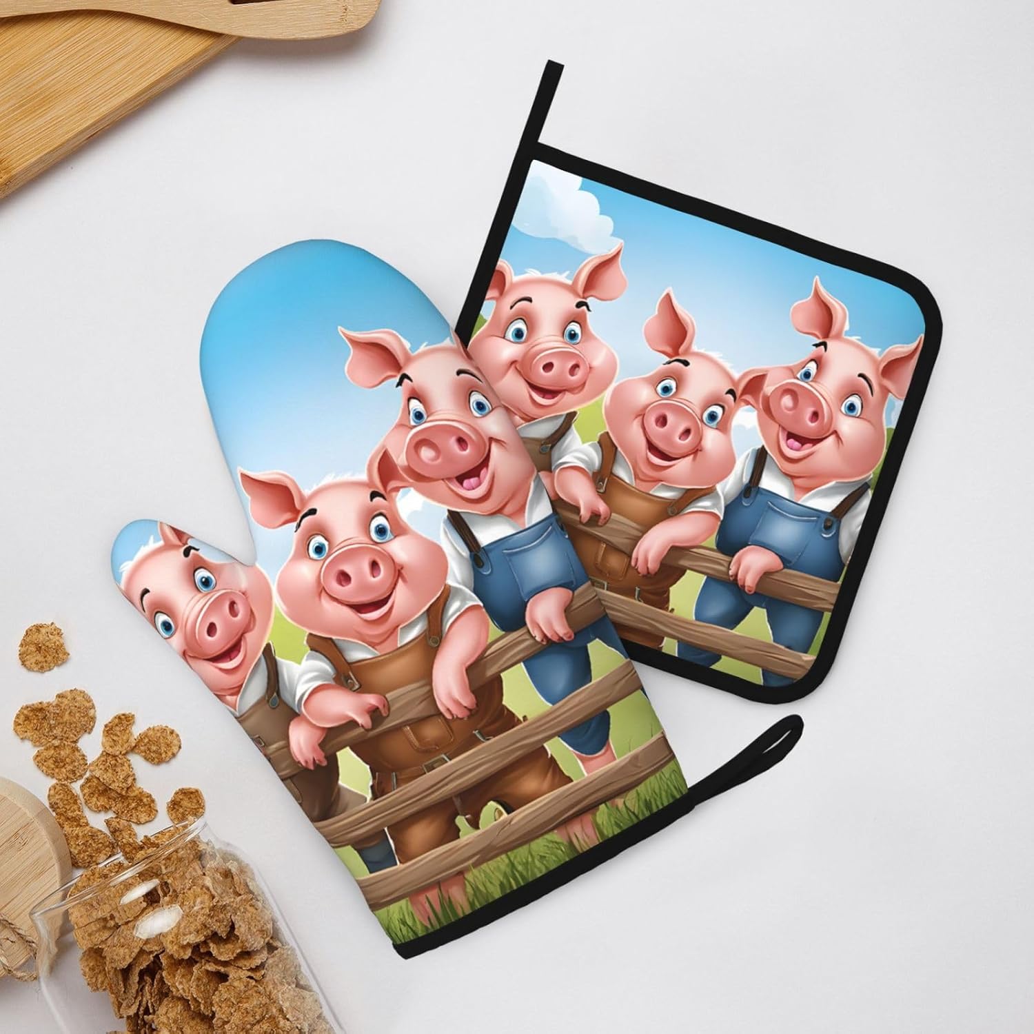 Oven Mitts and Pot Holders for Outdoor Cooking Baking BBQs Heat Resistant Polyester Silicone Oven Gloves Hot Pads, Kitchen Accessories Must Haves List – Funny Cute Pig