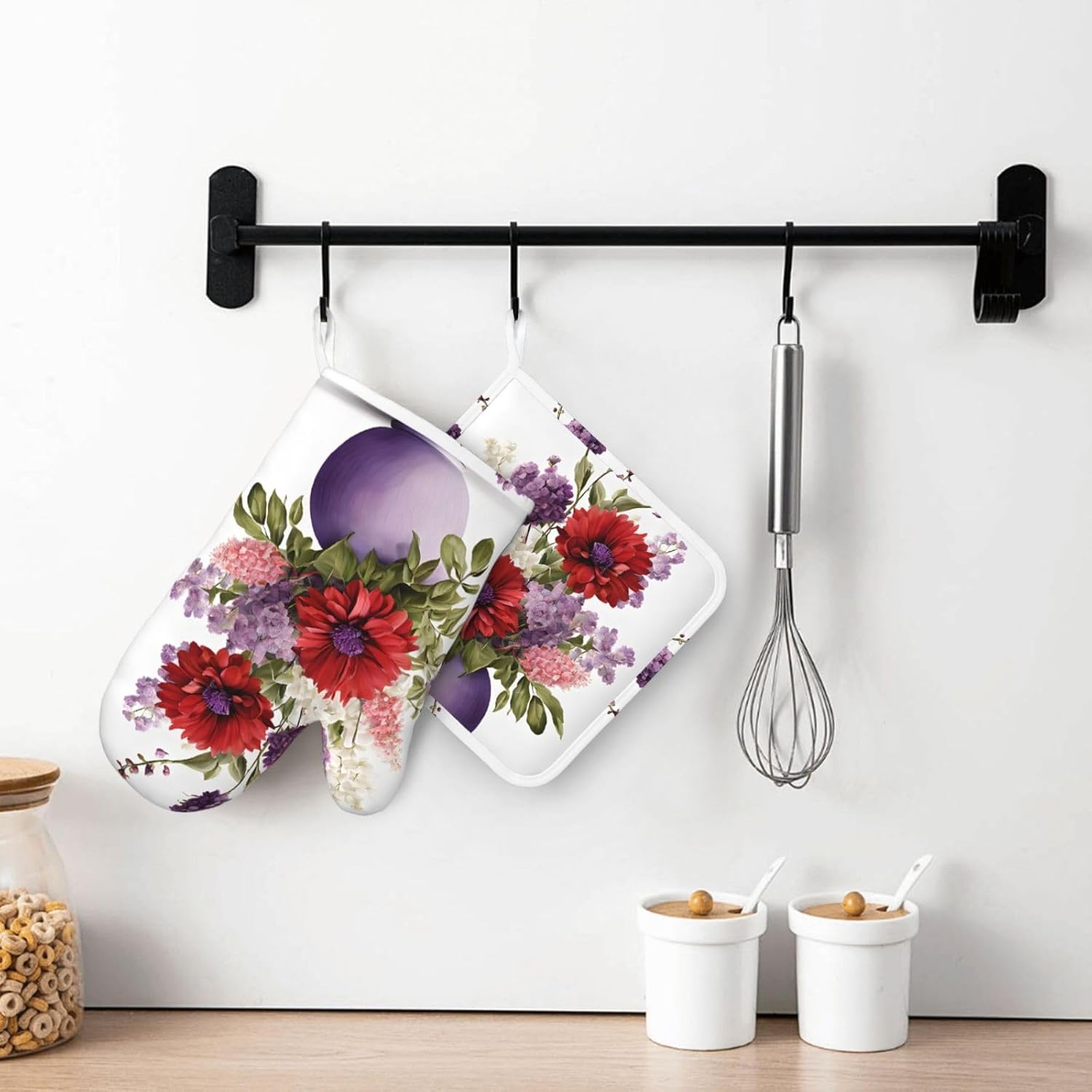Oven Mitts and Pot Holders for Outdoor Cooking Baking BBQs Heat Resistant Polyester Silicone Oven Gloves Hot Pads, Kitchen Accessories Must Haves List – Poppy Flower