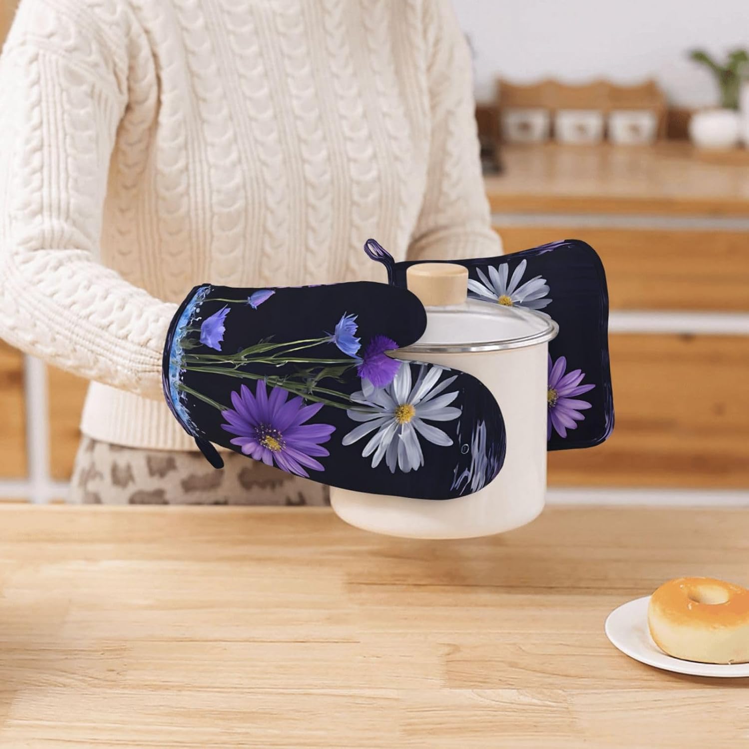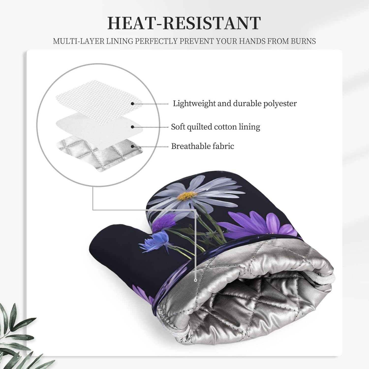 Oven Mitts and Pot Holders for Outdoor Cooking Baking BBQs Heat Resistant Polyester Silicone Oven Gloves Hot Pads, Kitchen Accessories Must Haves List – Purple Flower