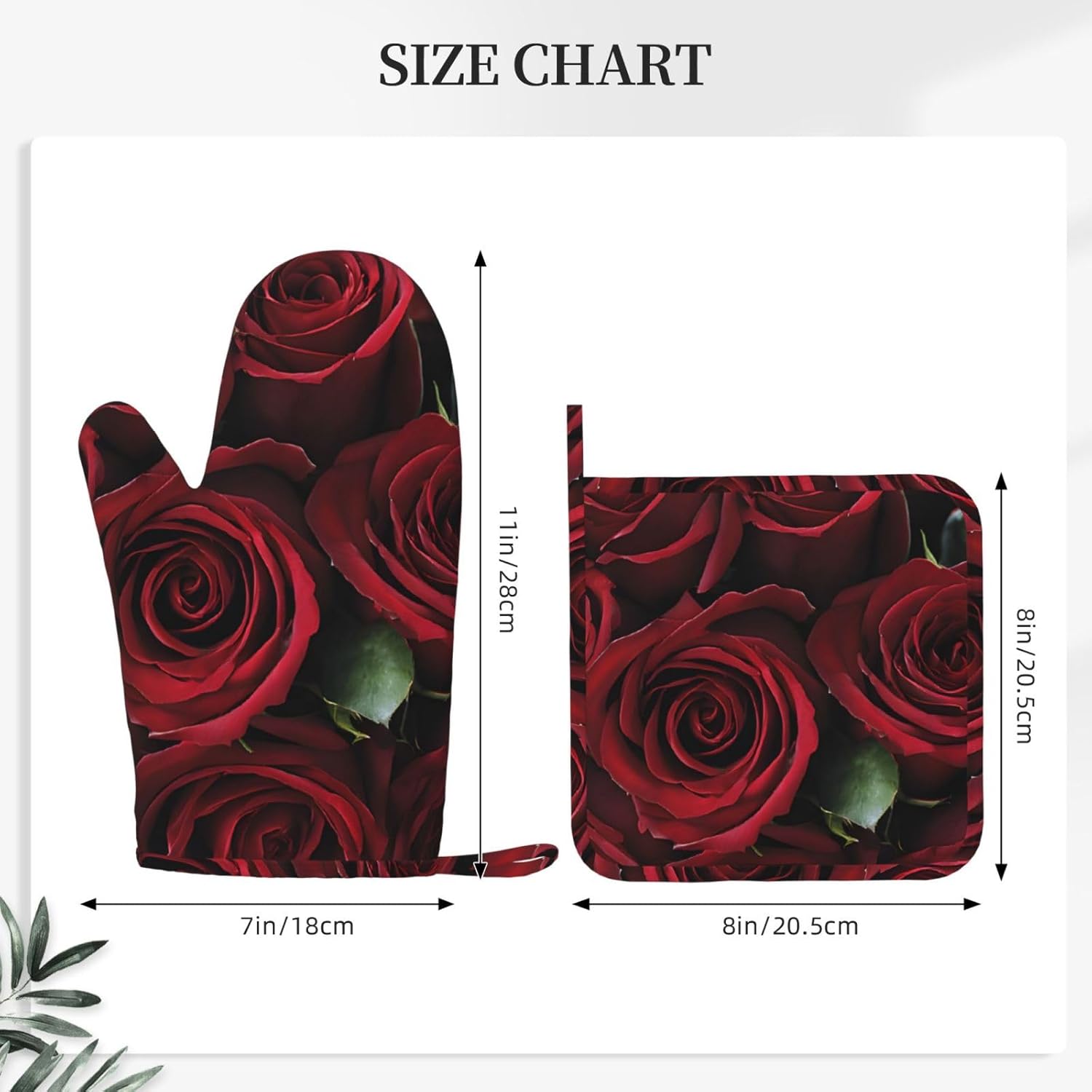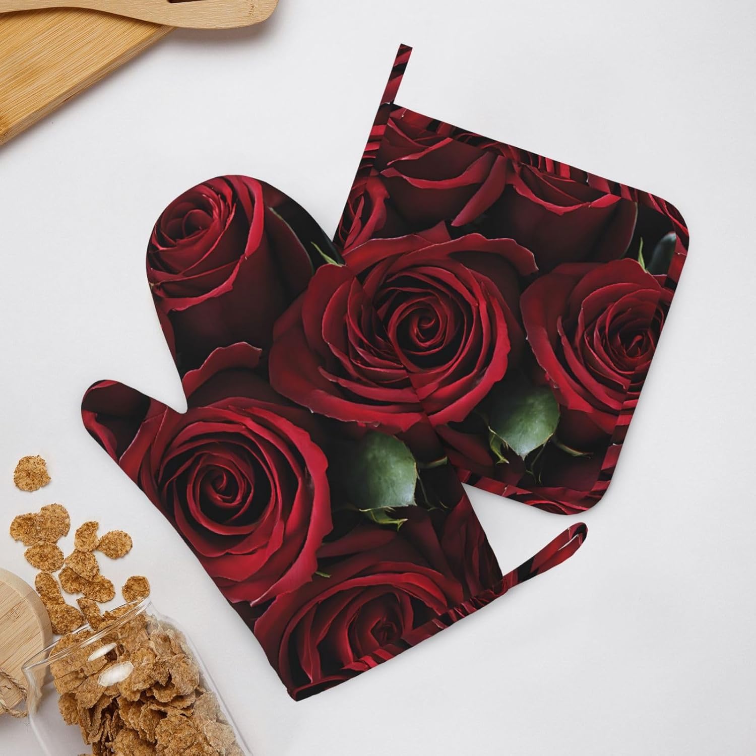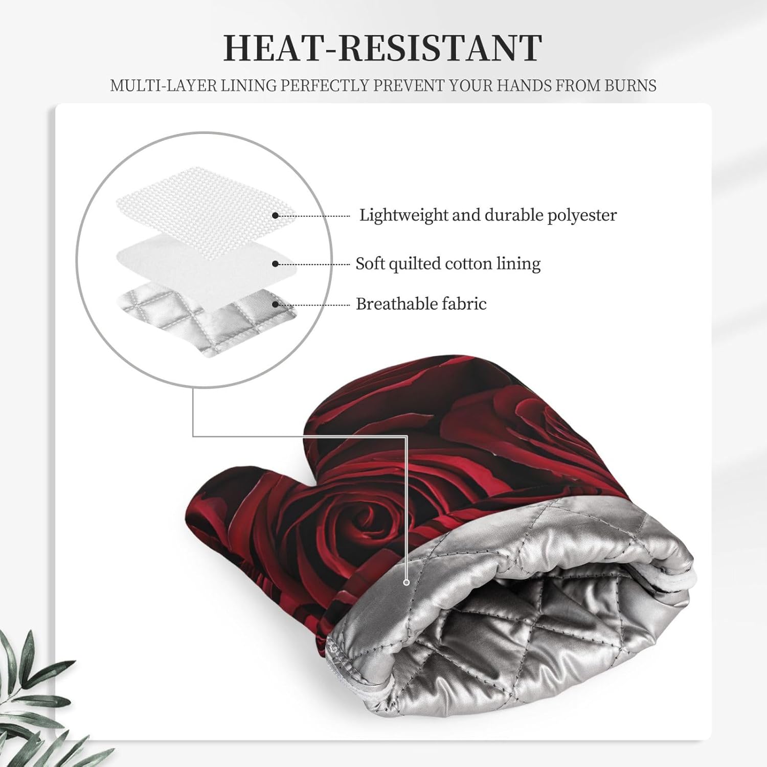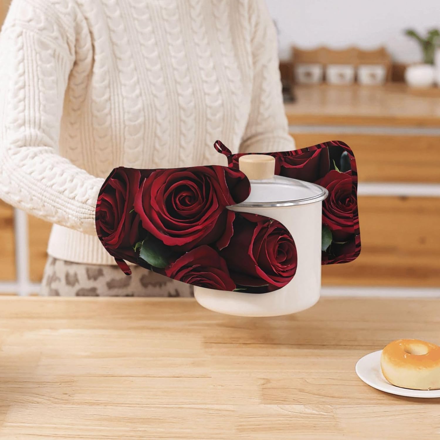 Oven Mitts and Pot Holders for Outdoor Cooking Baking BBQs Heat Resistant Polyester Silicone Oven Gloves Hot Pads, Kitchen Accessories Must Haves List – Red and Black Rose