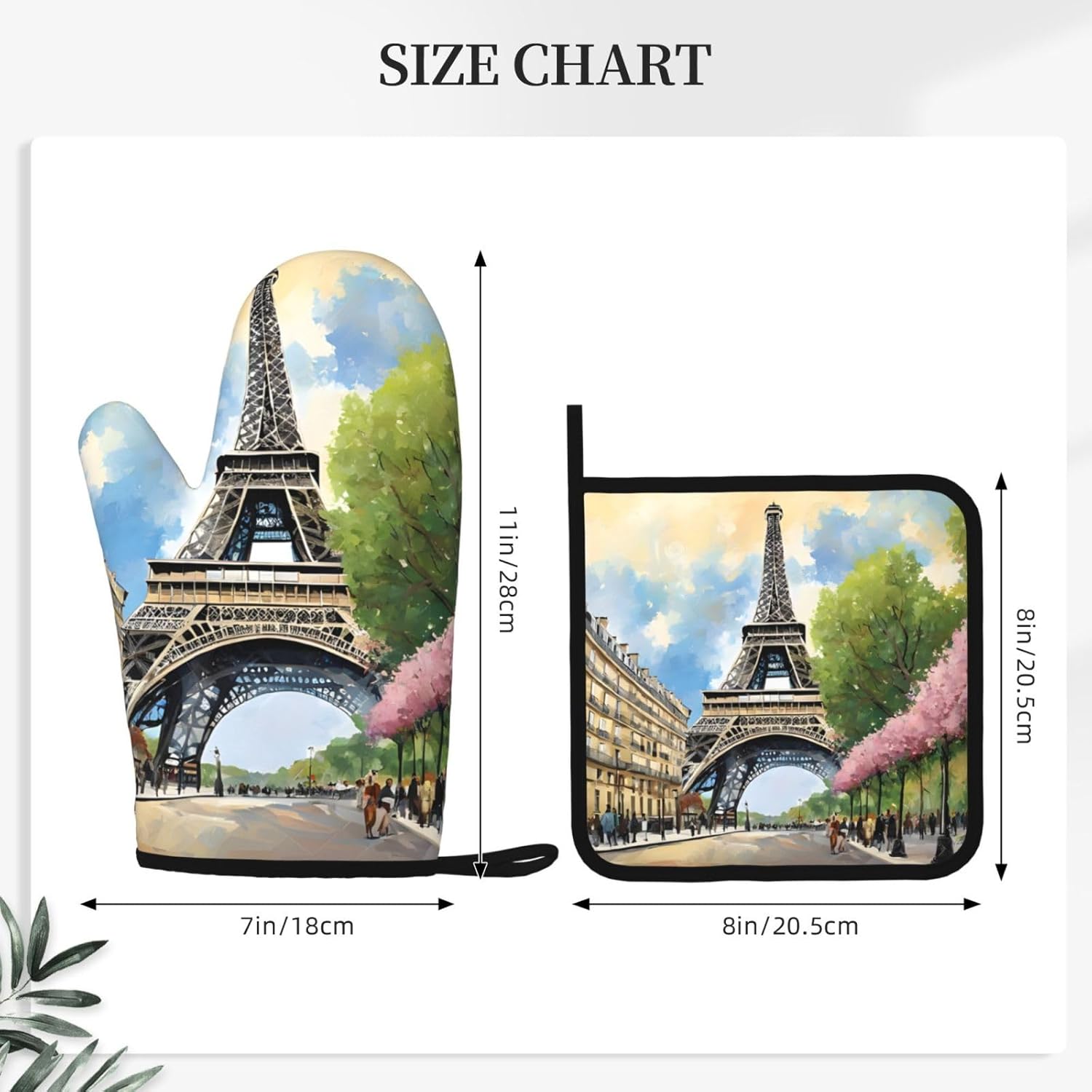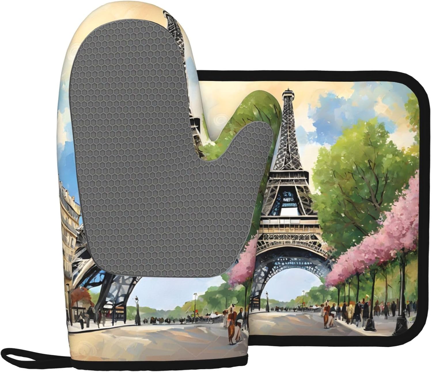 Oven Mitts and Pot Holders for Outdoor Cooking Baking BBQs Heat Resistant Polyester Silicone Oven Gloves Hot Pads, Kitchen Accessories Must Haves List – Romantic Paris Eiffel Tower