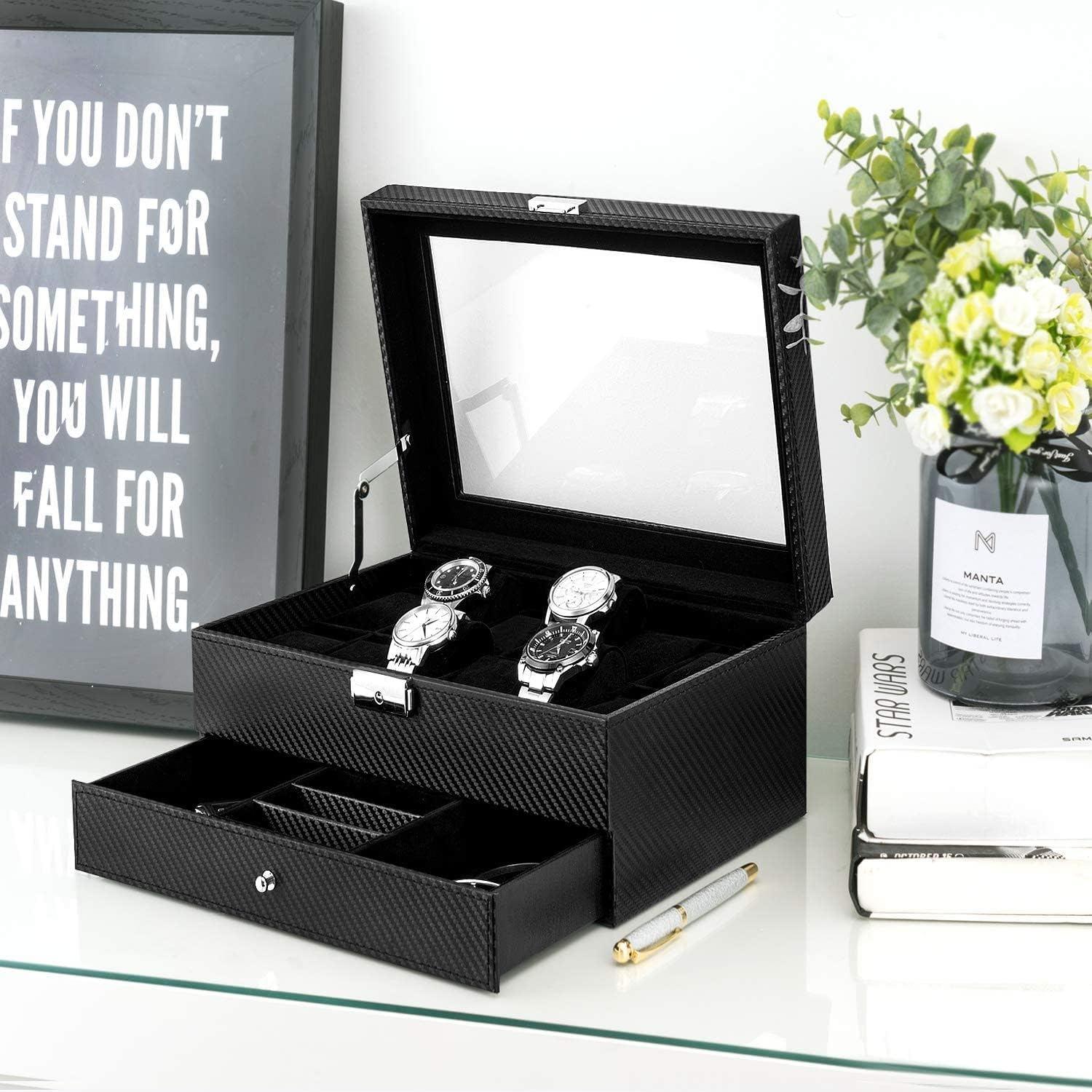 The 12 watch slots on the top compartment offer ample space for each watch, while the top glass keeps them visible, dust and moisture-free.