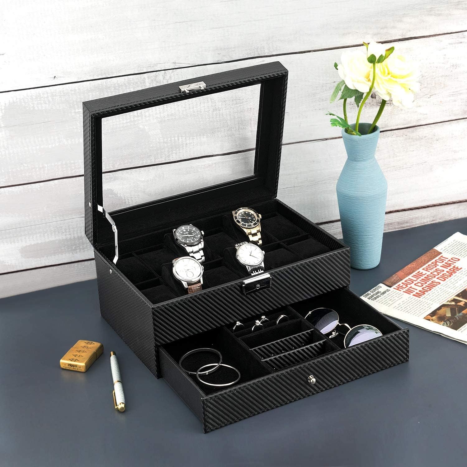 Oyydecor Watch Box 12 Slots Watch Organizer Jewelry Display Case Organizer with Jewelry Drawer for Storage and Display Lockable
