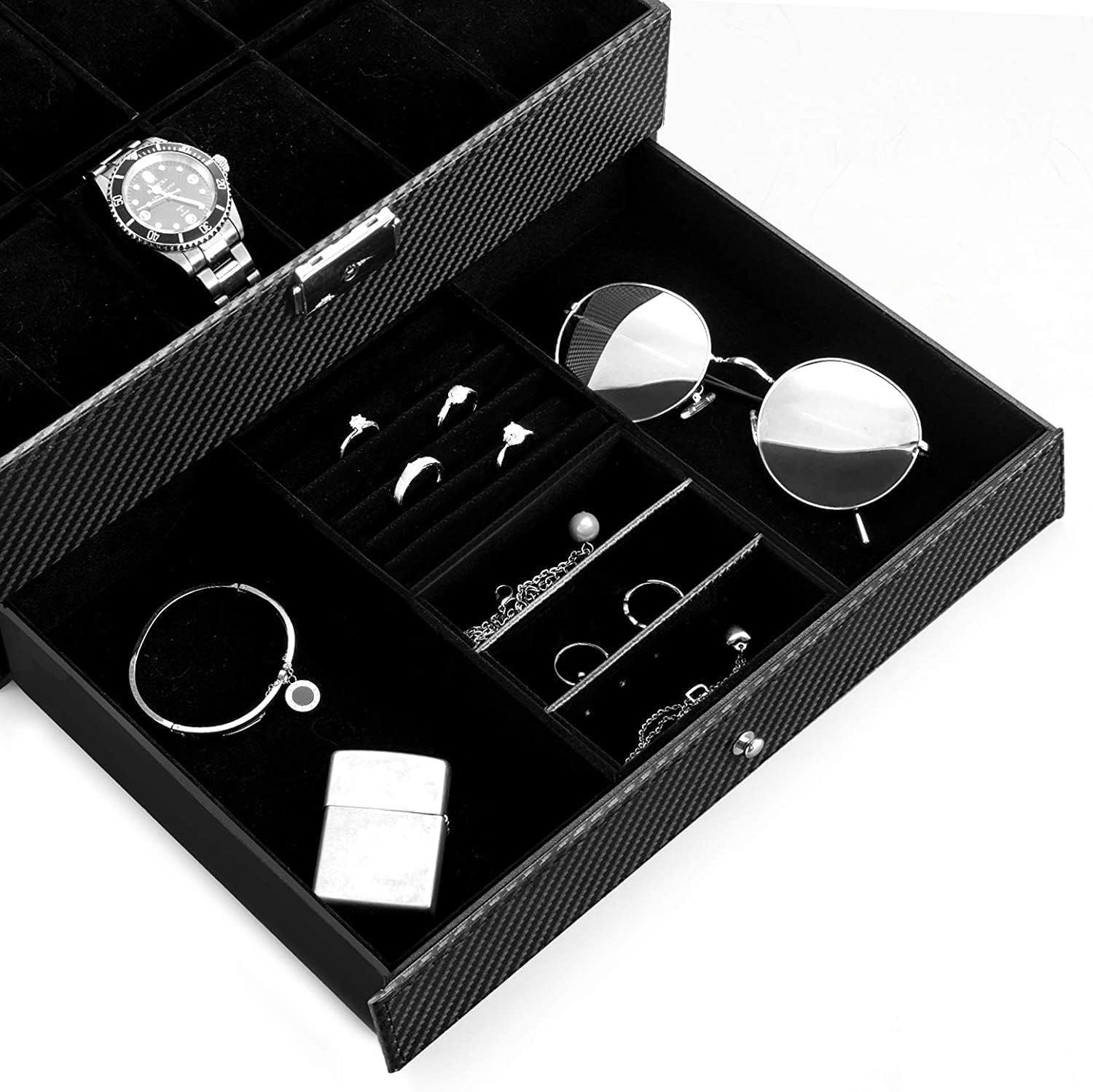 Double Layer: In the top layer of the jewelry case, there are 12 watch slots with removable velvet pillows. And in the bottom layer, there are adequate suitable area for your cufflinks, necklaces, bracelets, earring, brooches, neckties, sun glasses and any other jewelry and belongings.