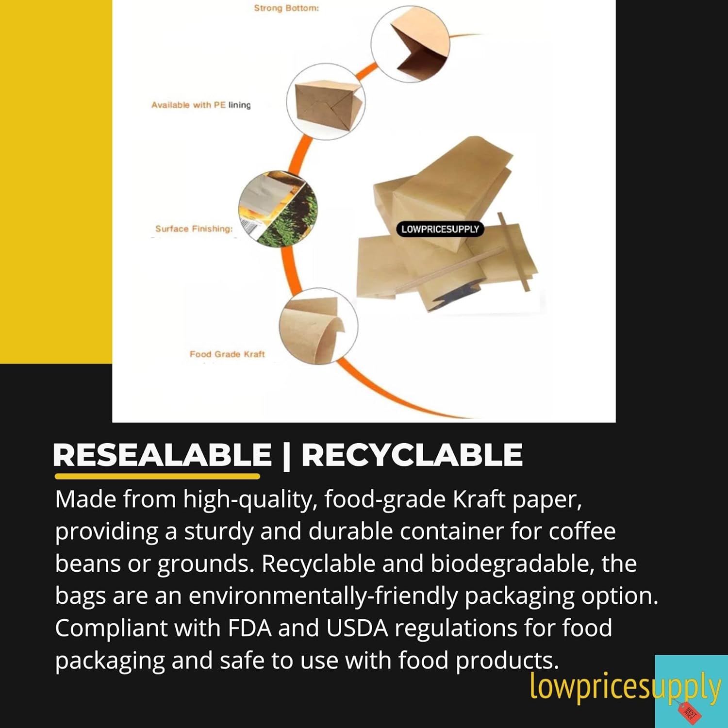 HIGH QUALITY | RECYCLABLE: Made from high-quality, food-grade Kraft paper, providing a sturdy and durable container for coffee beans or grounds. Recyclable and biodegradable, the bags are an environmentally-friendly packaging option. Compliant with FDA and USDA regulations for food packaging and safe to use with food products.