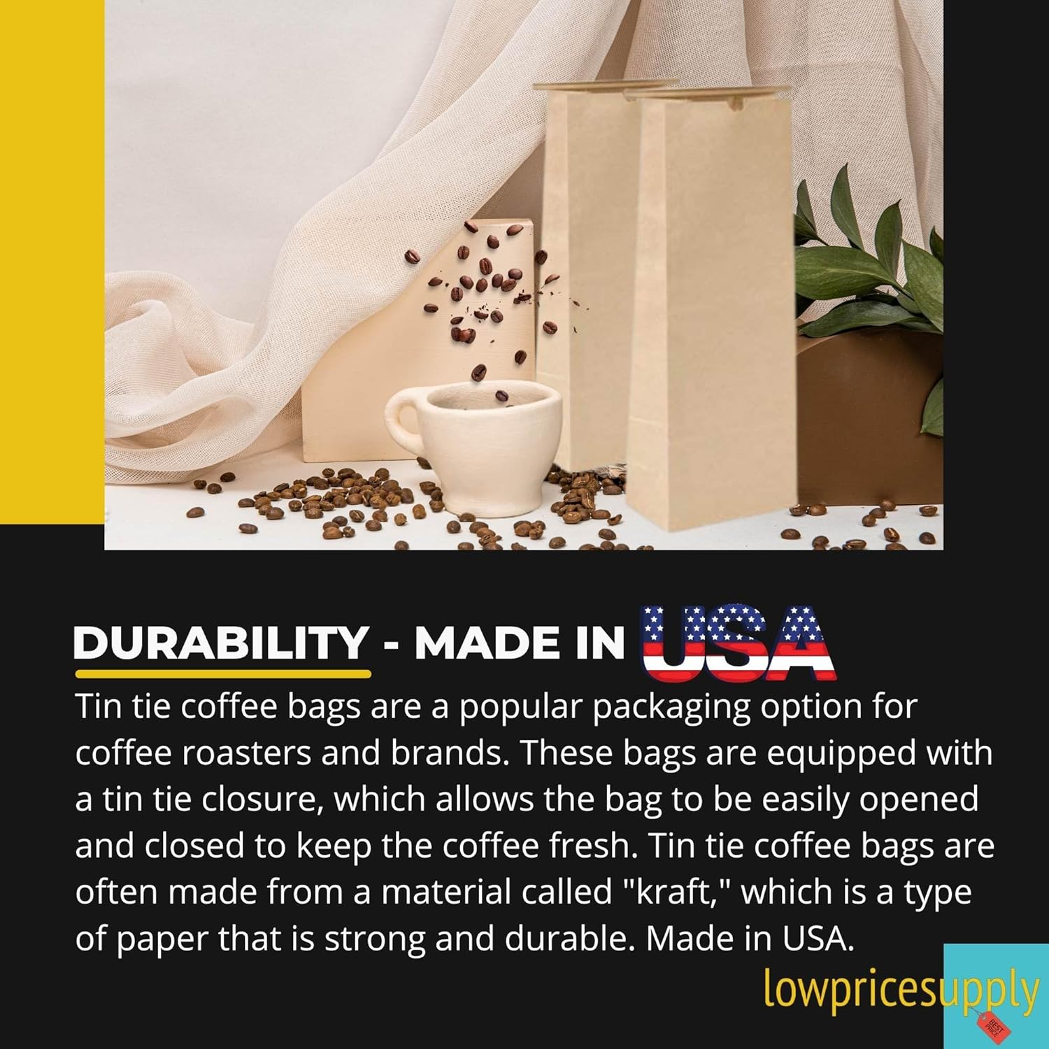 DURABILITY – Tin tie coffee bags are a popular packaging option for coffee roasters and brands. These bags are equipped with a tin tie closure, which allows the bag to be easily opened and closed to keep the coffee fresh. Tin tie coffee bags are often made from a material called “kraft,” which is a type of paper that is strong and durable. Made in USA.