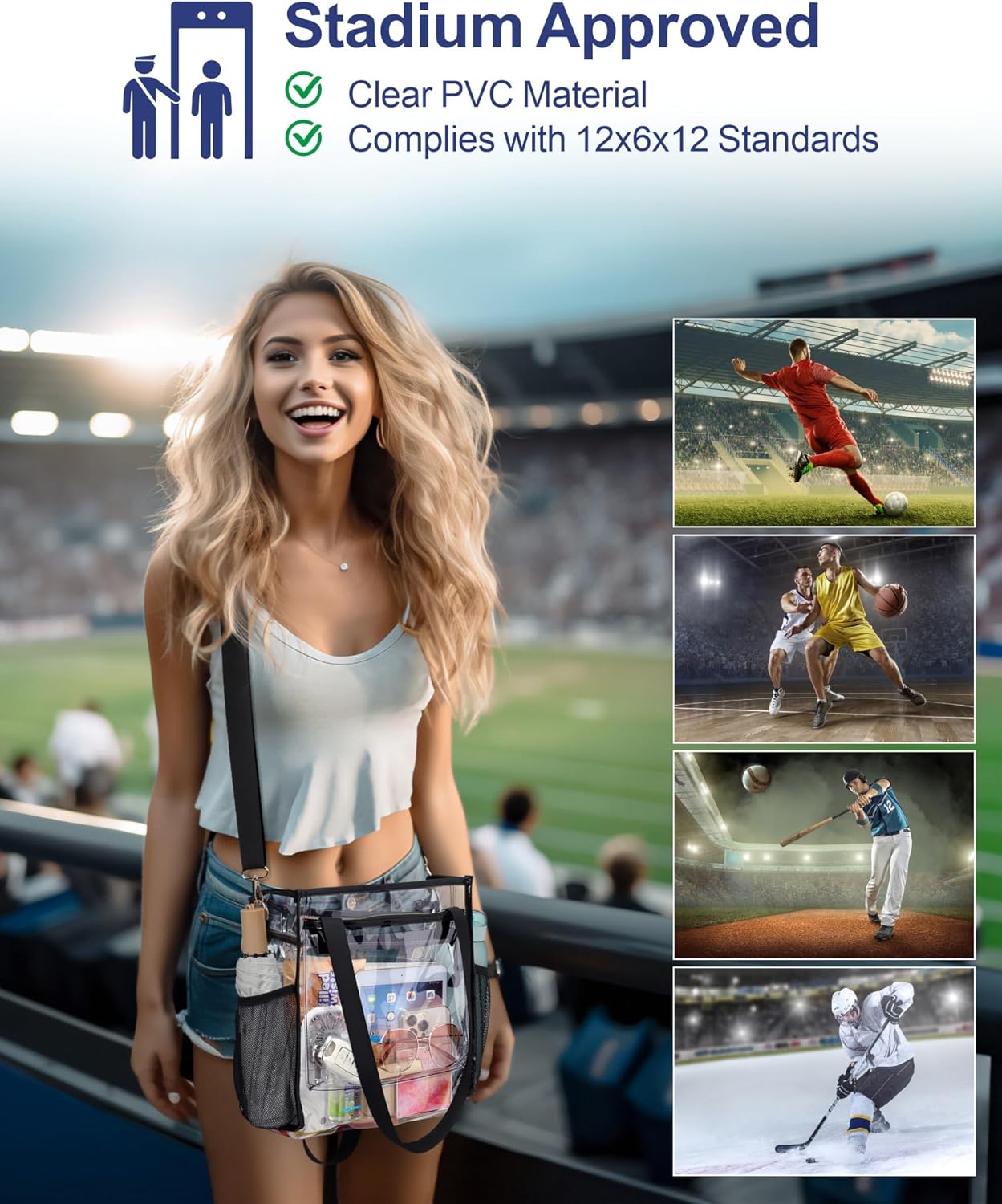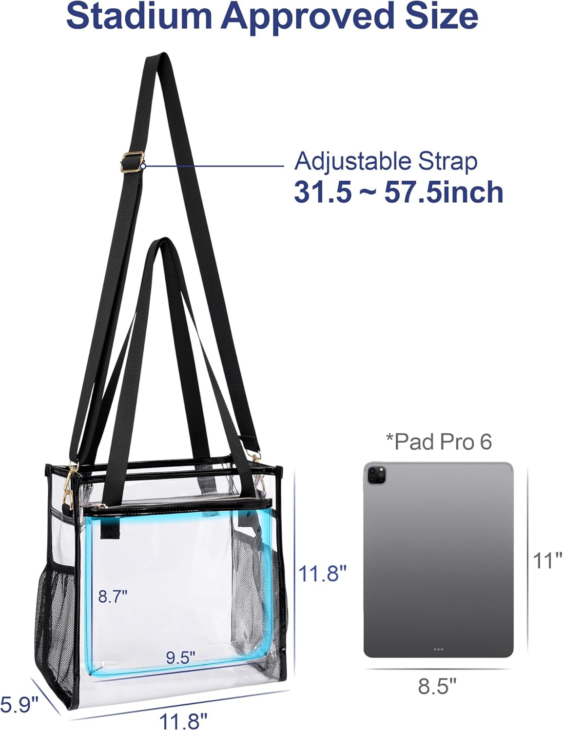 [Large Capacity, Efficiently Organized] This 12 x 6 x 12 inches see through bag features a clear design with a spacious main compartment, 2 side mesh and 1 front pocket for essentials like phone, wallet, keys, and tickets. Meet all your daily carrying needs in just one bag