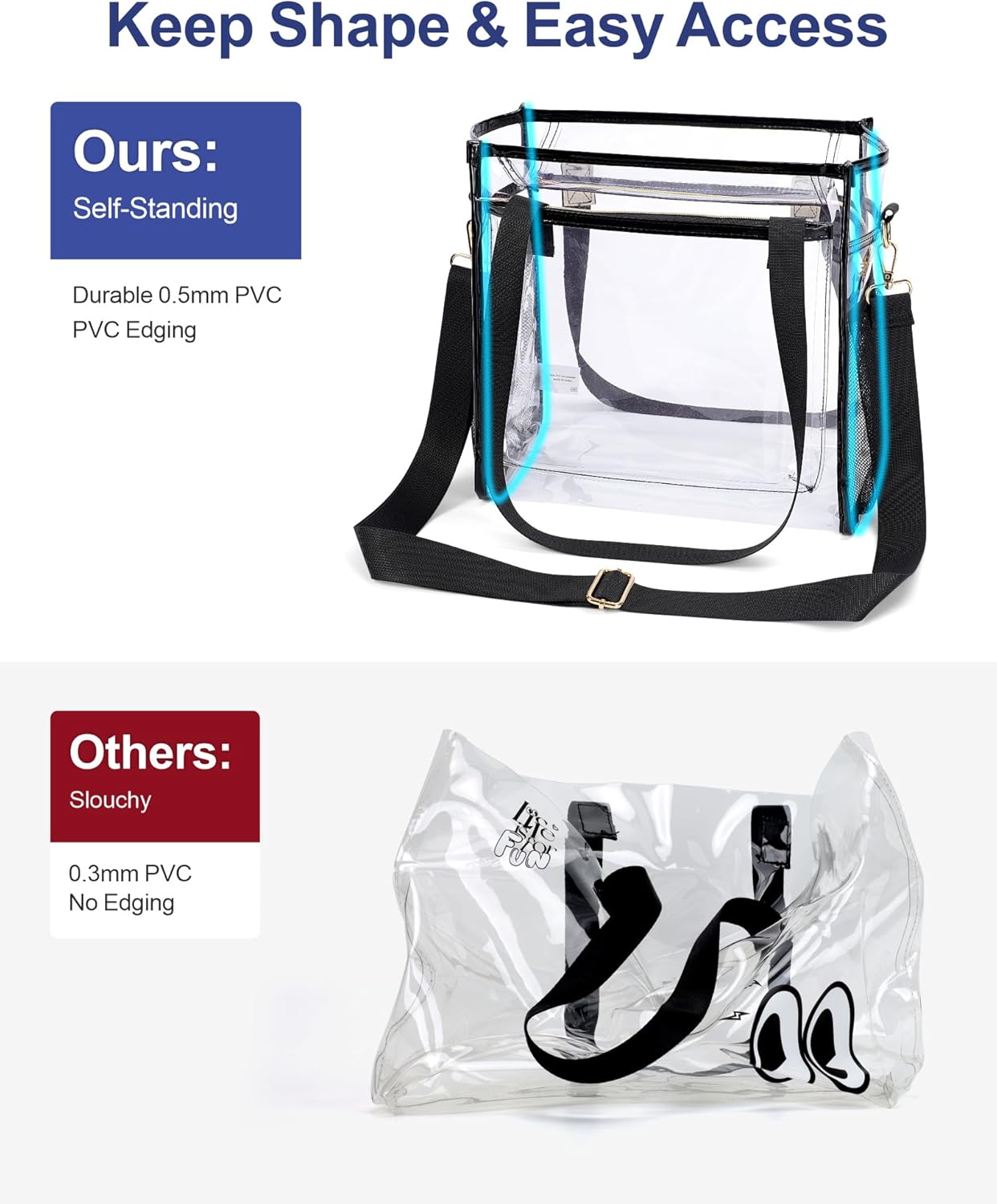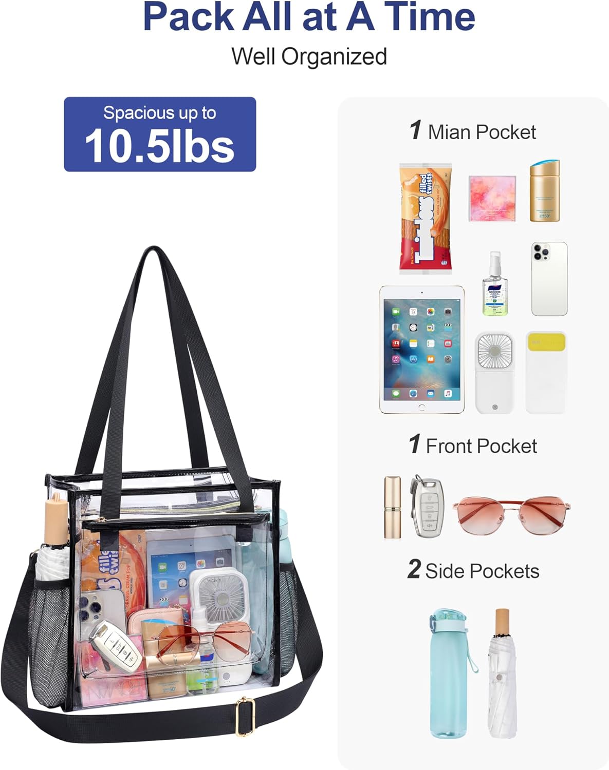 [Stadium Approved Clear Tote Bag Black] This 12″x12″x6″ tote bag with zipper complies with clear bag policy, ensuring you swiftly pass through security at sporting events and concert. Clear design allows for easy display items and quick item access, saving time for a smoother entry experience