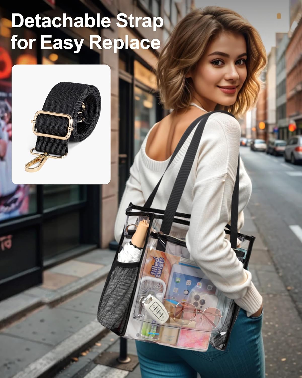 [Detachable Strap for Versatile Use] Compared to regular ones, our clear stadium tote bag strap is extra longer and removable. Easily switch between a crossbody bag and handbag by adding or removing the strap, suitable for any body type and outfit