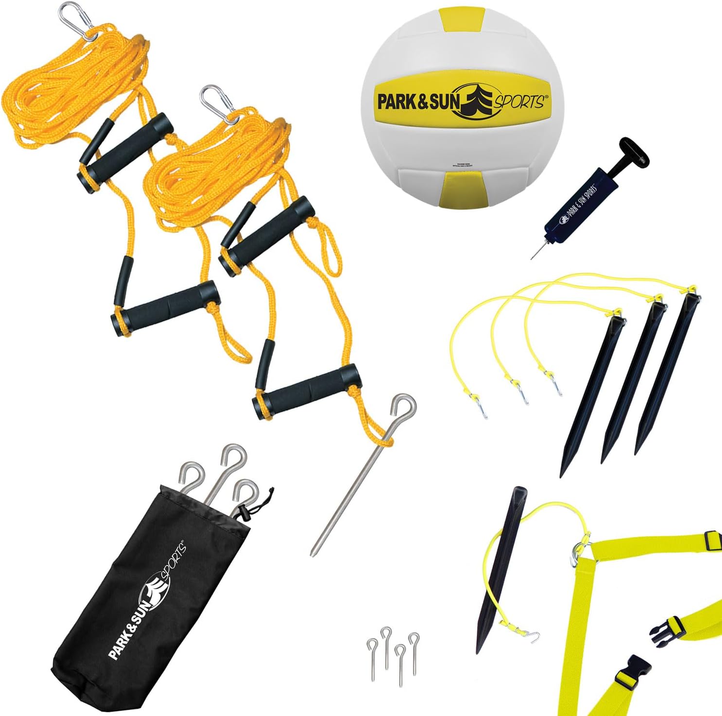 Official Court: 1-inch yellow high visibility web boundary, with 4-inch ground stakes for grass, and bungee stakes for sand. Hand winder to neatly store tangle free, 1800 denier storage equipment bag; 18 Panel SoftTouch volleyball