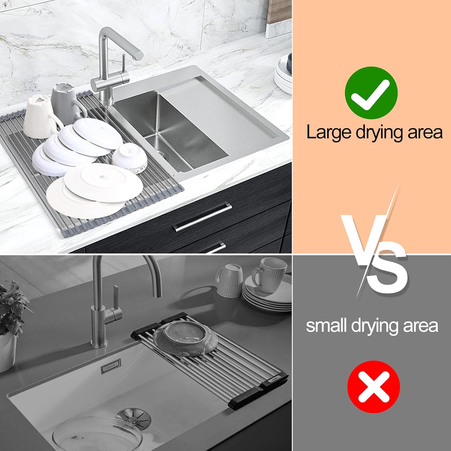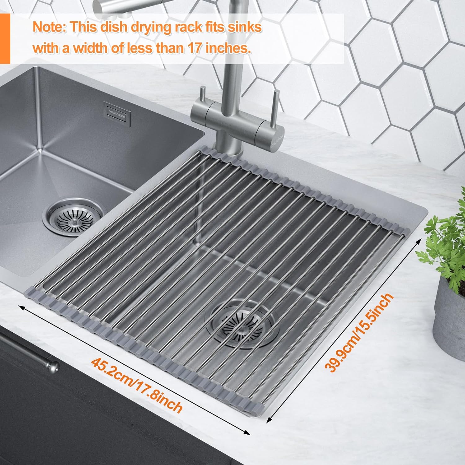 [SUPERIOR QUALITY]: The dish drying rack is 15.5in x 17.8in, made of 20 stainless steel tubes. Dish racks for kitchen counte fit sinks with a width of less than 17 inches. Before purchasing, be sure to measure the size of your sink so that you can have the perfect kitchen sink organizer and storage tool.