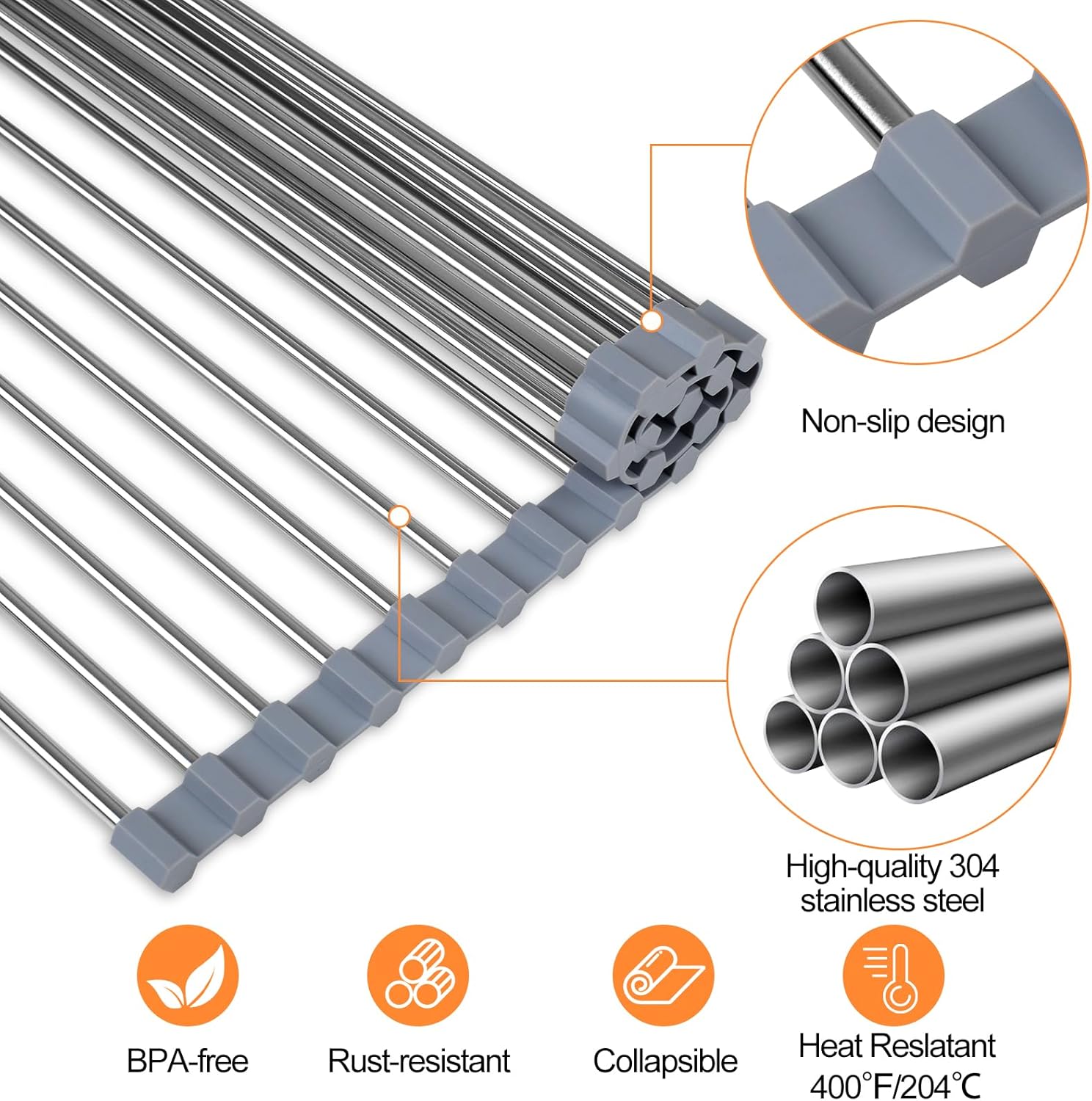 [SILICONE COATING]: Our dish drying rack features upgraded non-slip and heat-resistant food-grade silicone wrapping, providing enhanced stability and preventing any slippage. With its BPA-free silicone coating, the drying rack kitchen is safe to use on fruits, veggies, and even hot items straight out of the oven. Protect your countertops from hot pans and maintain a neat and organized kitchen.