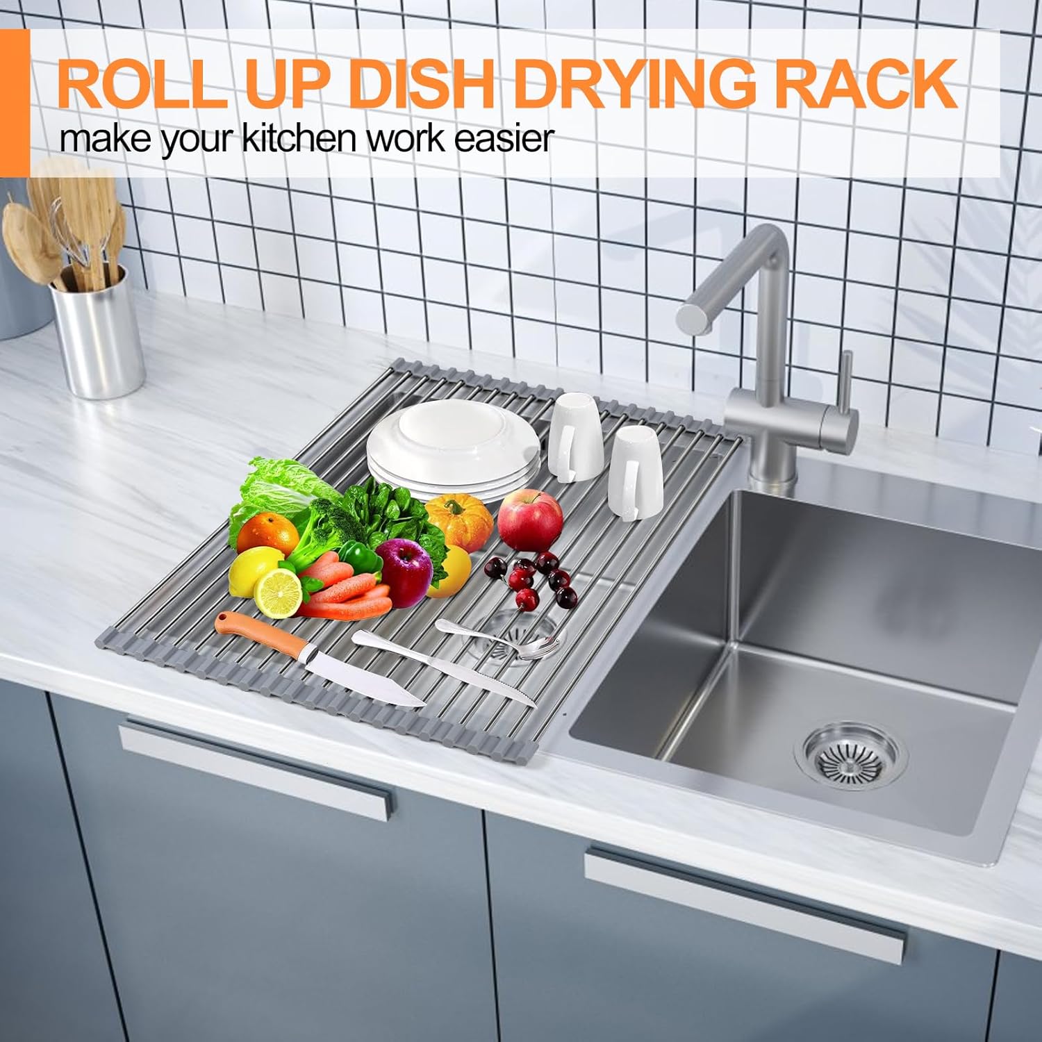 [SPACE-SAVING AND EASY TO STORE]: This drying rack kitchen features a foldable design. You can effortlessly roll it up for compact storage, ensuring a clutter-free kitchen and saving valuable countertop space. Dish drying rack is collapsible design not only maximizes space utilization but also makes cleaning a breeze. Dish drainer is suitable for both handwashing and machine washing, making dish drying rack convenient and practical.