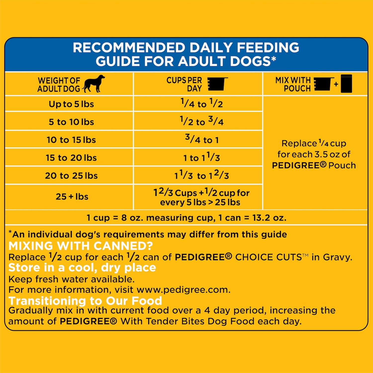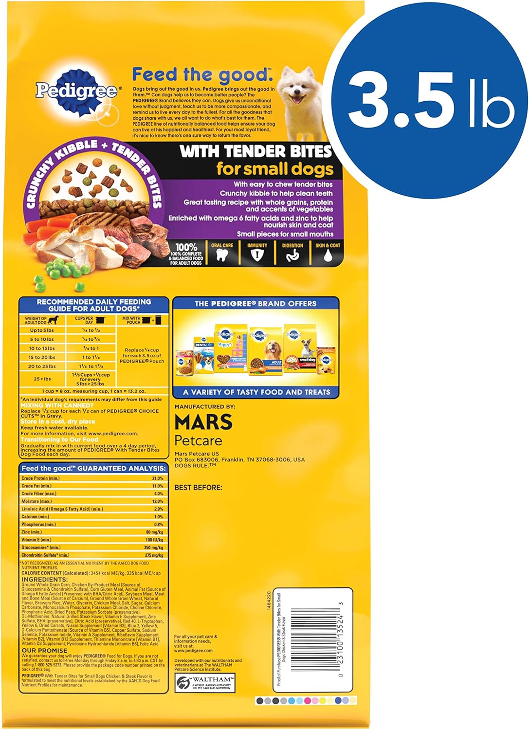 Contains one (1) 3.5 lb. bag of PEDIGREE with Tender Bites Complete Nutrition Adult Small Breed Dry Dog Food, Chicken & Steak Flavor