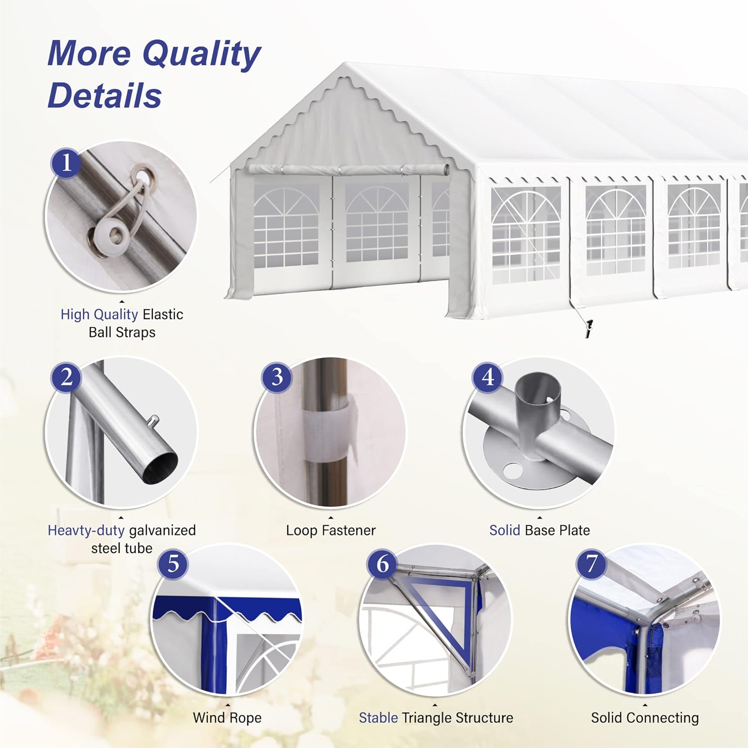 【Sturdy Steel Frame】Our Party Tent features a high-quality, heavy-duty powder-coated galvanized steel tube frame that is corrosion-resistant. Our tubes are 30% thicker and more durable than other, ensuring superior quality and robust support. With a steel tube diameter of 1.5 inches (38 mm) and metal connector diameter of 1.66 inches (42 mm), you can be confident in the strength and stability it provides.