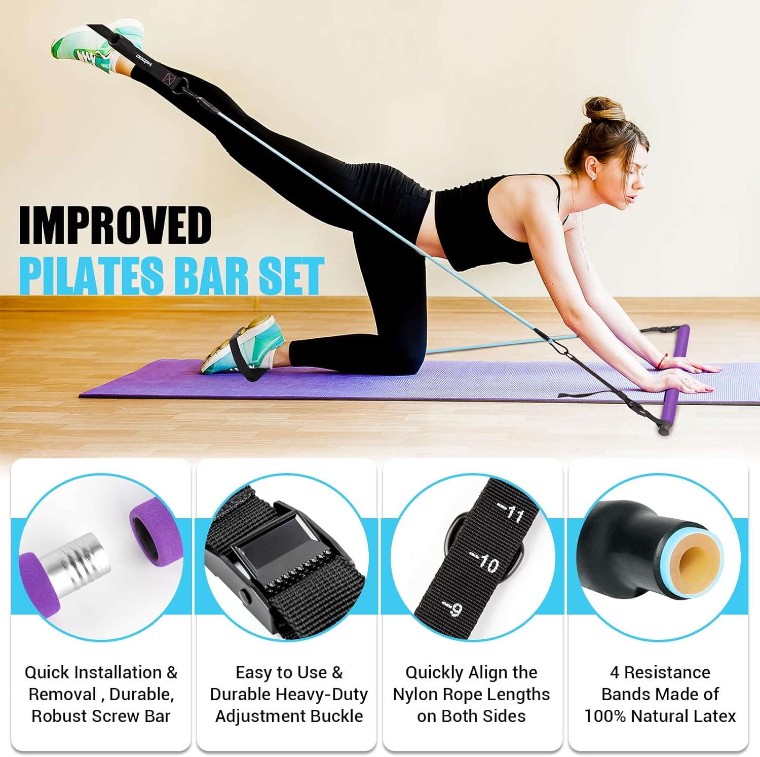 [Convenient Metal Adjustment Buckle]: Our pilates stretch fusion bar come with newly upgraded heavy-duty metal adjustment buckle and nylon rope with clear values. Just press the metal button lightly, you can adjust the total length of pilates bar to your desired length more quickly and accurately when training different movements. The adjustable ranges from 4.3 inches to 18 inches. Our pilates bar kit with 4 resistance bands are suitable for those who are between 5.2′-5.8′ height to practice.