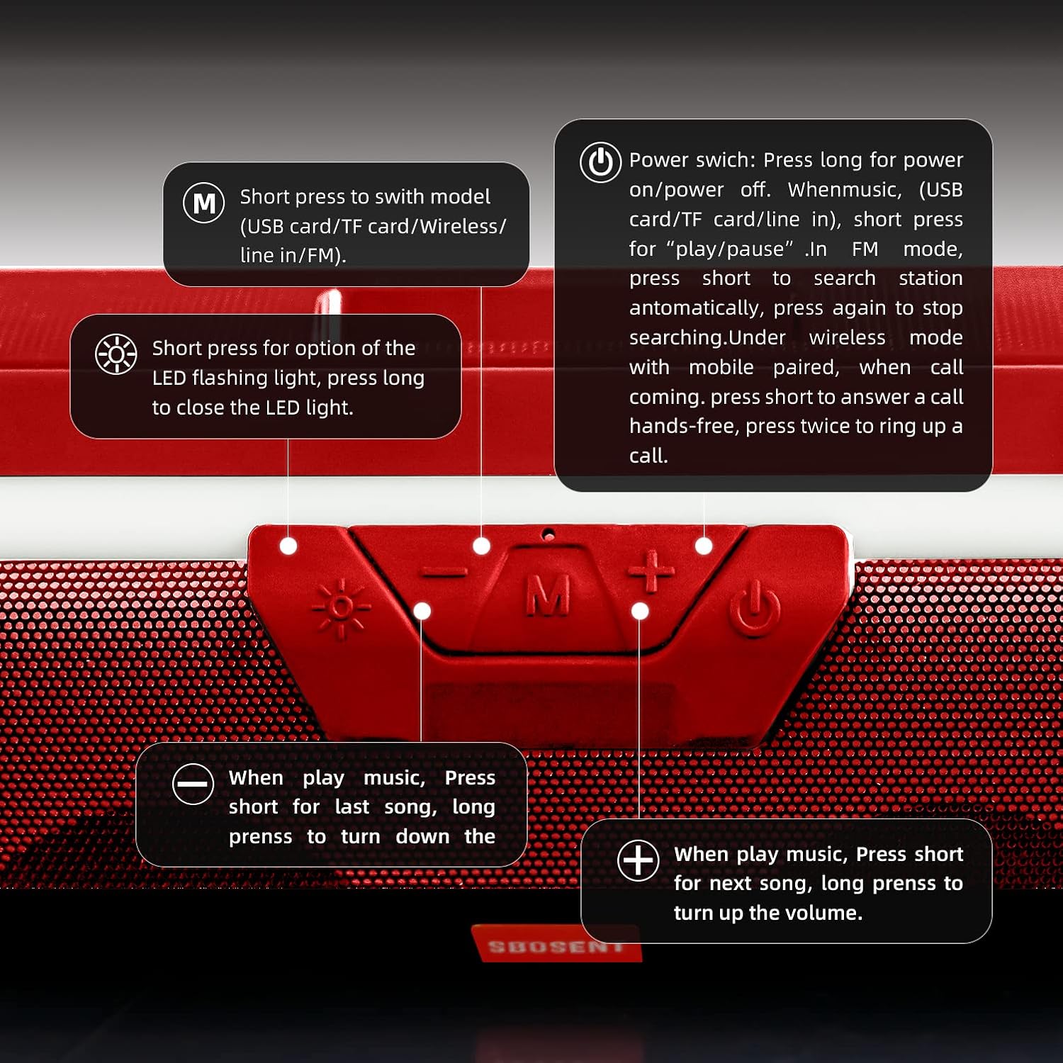 Portable Bluetooth Speakers with Light, Wireless Speaker, V5.1USB Card, Micro SD Card & FM Radio, for Outdoor, Indoor, Travel, Beach, Camping. (Red, Max)