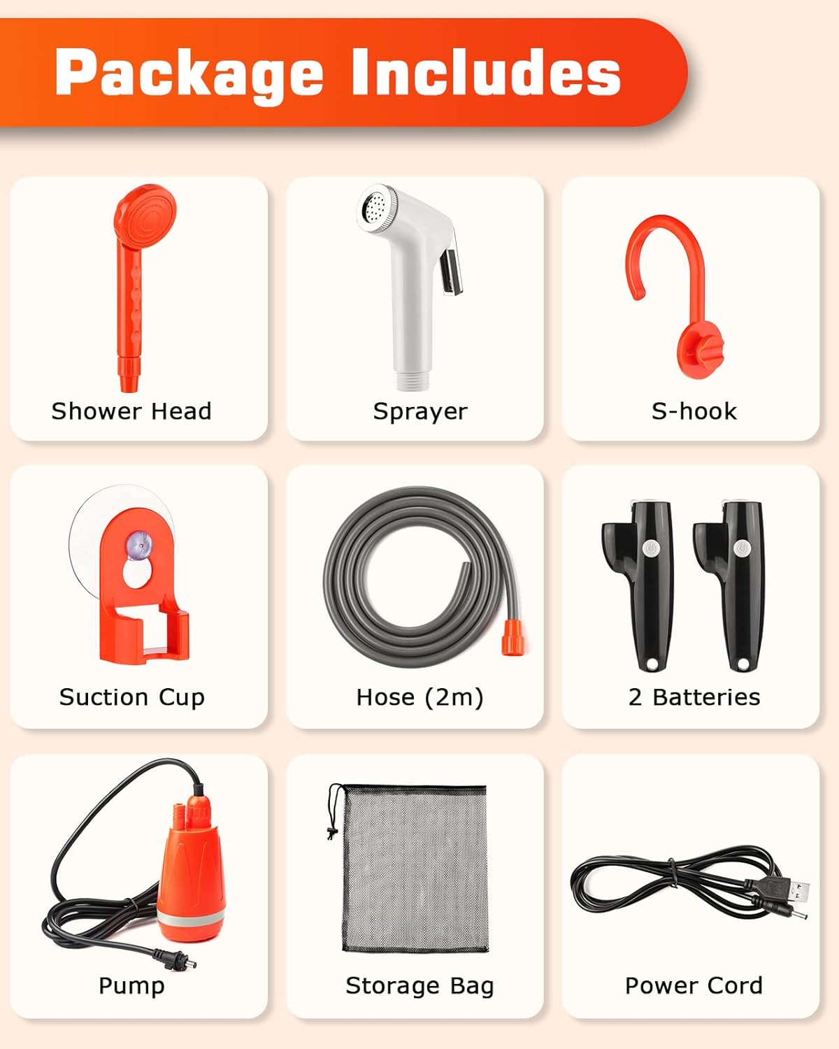 ๐ฟ 80-120Min Usage Time ๐ฟ: Equipped with 2 batteries, enjoy up to 120 minutes of continuous operation for uninterrupted outdoor portable shower. USB cord charging ensures convenient recharging.