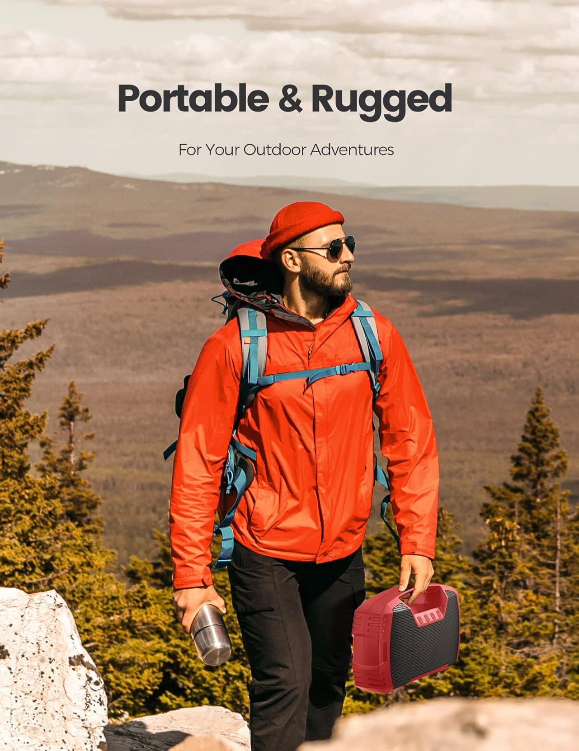 RUGGED PORTABLE OUTDOOR SPEAKER: This travel speaker with an ergonomic handle makes it much more convenient to take it with you on the go. You can enjoy your favorite music, podcasts, and audiobooks, indoors or outdoors. This wireless speaker is durable and shockproof enough to withstand a few bumps and bruises along the way thanks to its front and back metal grills. What’s in the box: a Bluetooth speaker, a Type-C charging cable, an AUX cable, and a user guide