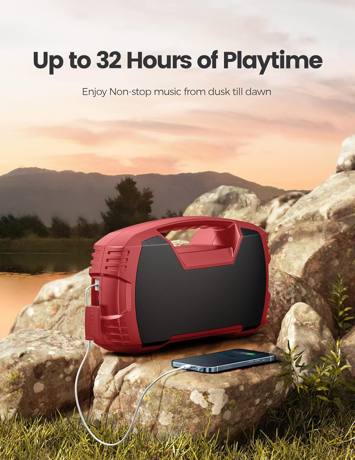 UP TO 32 HOURS PLAYBACK: The rechargeable portable Bluetooth speaker lets you enjoy up to 32 hours of crystal clear audio at medium volume. It can pump out crisp, clear vocals and deep, powerful bass at home, in the garage, or on the go. The wireless outdoor speaker can double as a portable power bank—you can charge your cellphone or other USB devices via its built-in USB port. No need to carry an extra charger
