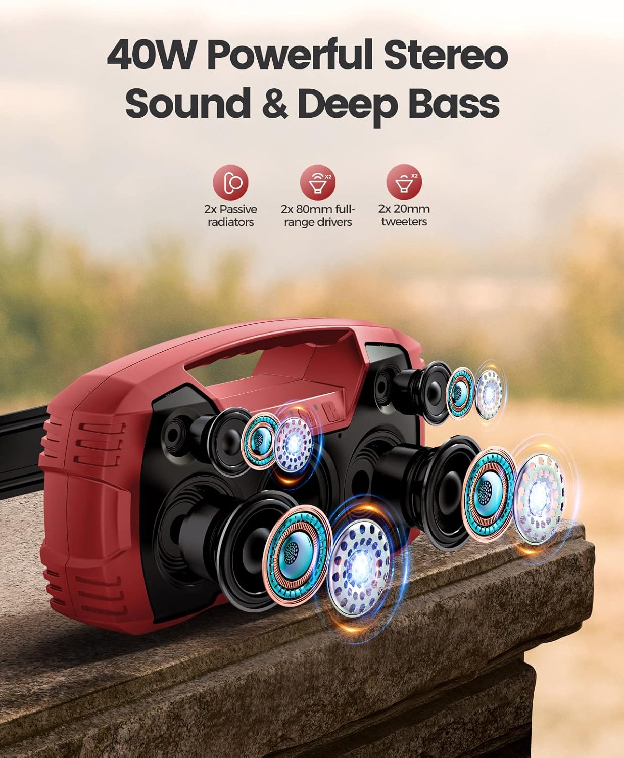 SUPER LOUD STEREO SOUND: This 40W portable Bluetooth speaker features 2 tweeters and 2 full-range drivers to stream up to 60W loud and clear sound to your home or outdoor parties. 2 additional passive radiators in the front and back help to improve bass performance. It can deliver crisp highs, clear midrange, and rich, punchy bass. For a truly wireless stereo sound experience, you can also add a second one to create a stereo pair and amp up the fun