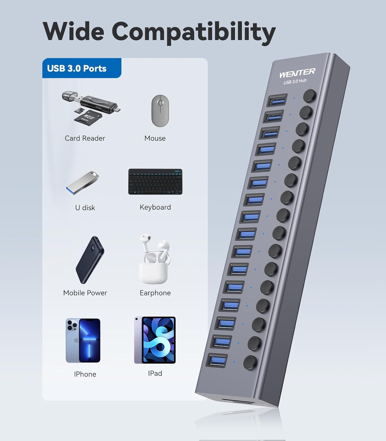 Powered USB Hub – WENTER 16 Ports USB 3.0 Hub, 5 Gbps Data Port, Aluminum Housing, Individual On/Off Switches, 12V/3A Power Adapter, Multiport Powered USB 3.0 Hub for PC, Laptop, Computer, Mobile HDD