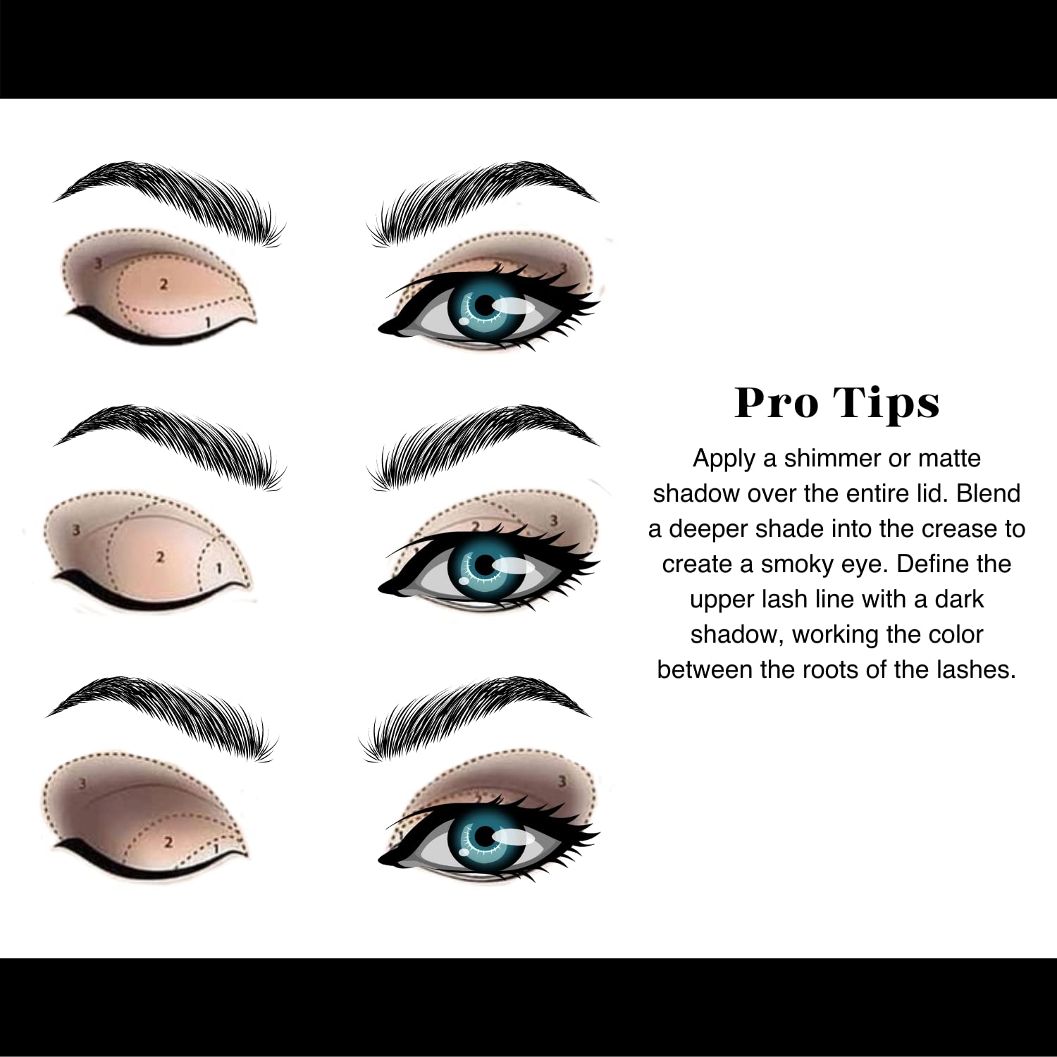 Pro Tips: Apply a shimmer or matte shadow over the entire lid. Blend a deeper shade into the crease to create a smoky eye. Define the upper lash line with a dark shadow, working the color between the roots of the lashes. One simple step can transform ordinary to extraordinary!