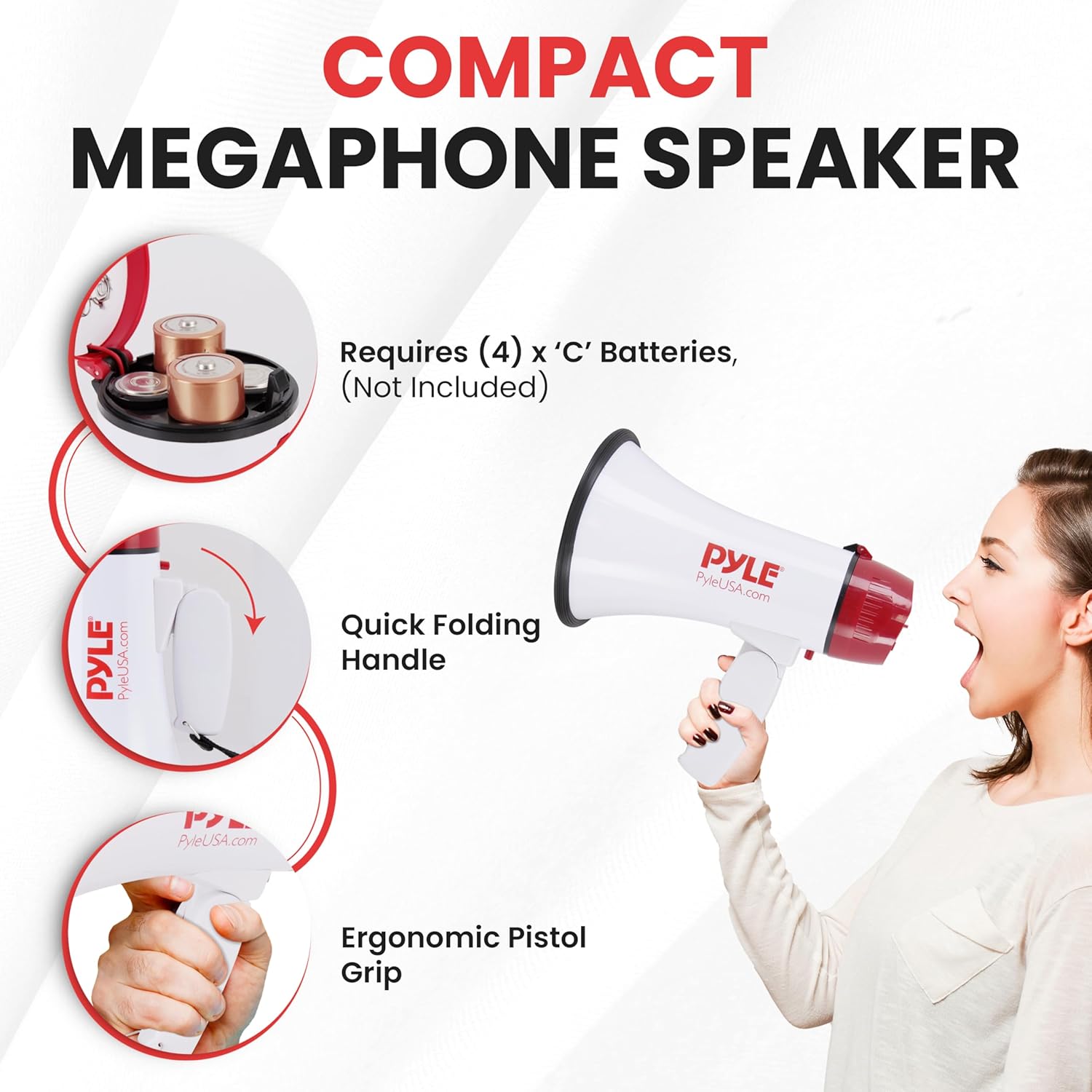 BATTERY OPERATED AND PORTABLE: This compact megaphone speaker operates on (4) x ‘Câ€️ batteries (not included), ensuring long-lasting performance. Its quick folding handle and lightweight chassis make it perfect for on-the-go use.
