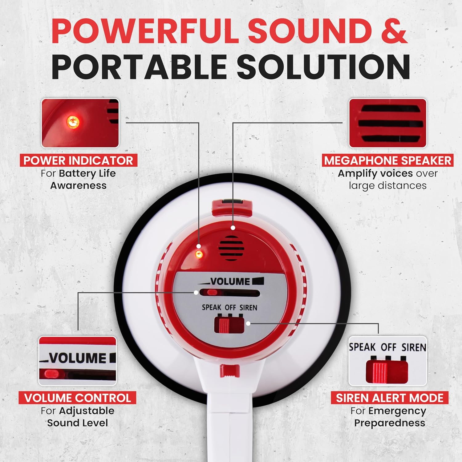 ADJUSTABLE VOLUME CONTROL: The megaphone speaker comes equipped with an adjustable volume control, allowing you to modify the sound to your preference. The power-saving OFF switch helps preserve battery life.