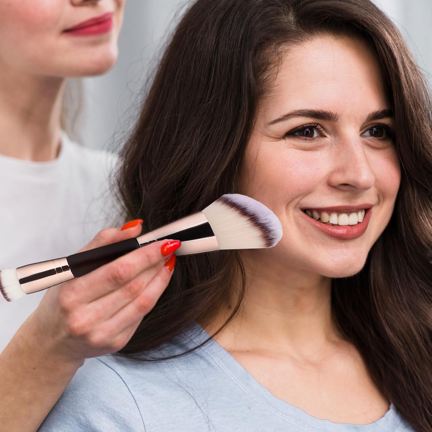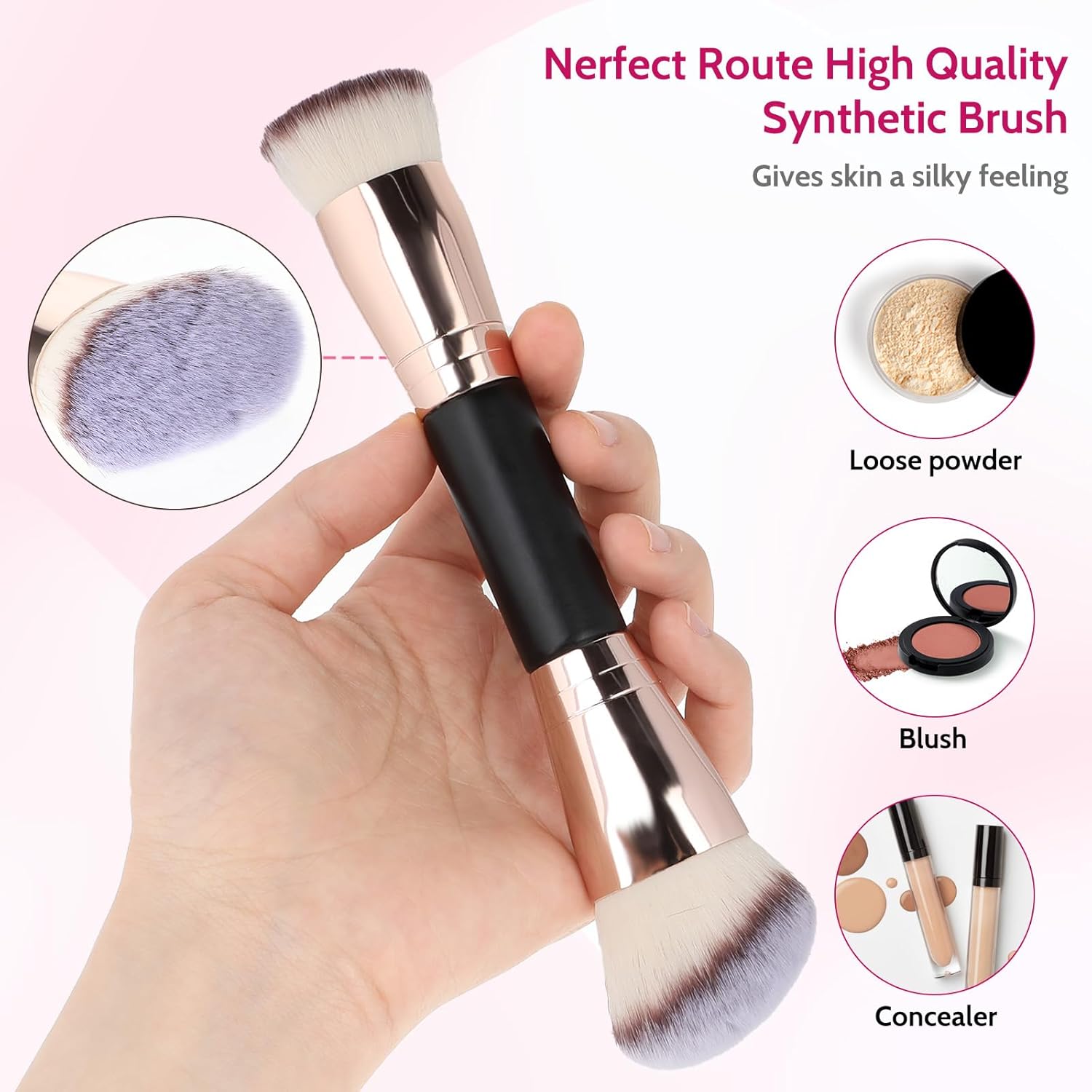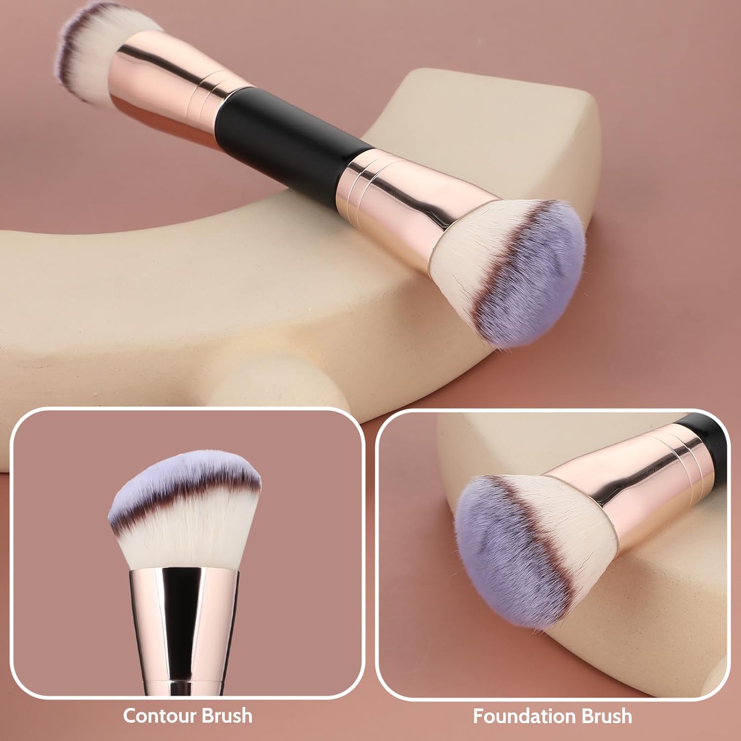 Qianyu Makeup Brushes Double Ended 2-in-1 Foundation Contour Brush (Flat/Angled) Premium Kabuki Highlighter Bronzing Concealer Brush for Liquid Cream Powder Blending Face Cosmetics Tools