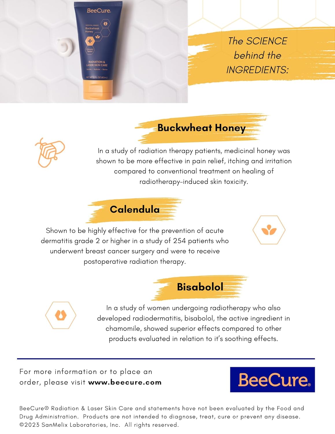 This BeeCure cream soothes, hydrates, and revives irritated skin resulting from radiation and laser therapy. The proprietary formulation of BeeCure Radiation & Laser Skin Care includes unique ingredients like buckwheat honey, calendula, and bisabolol.