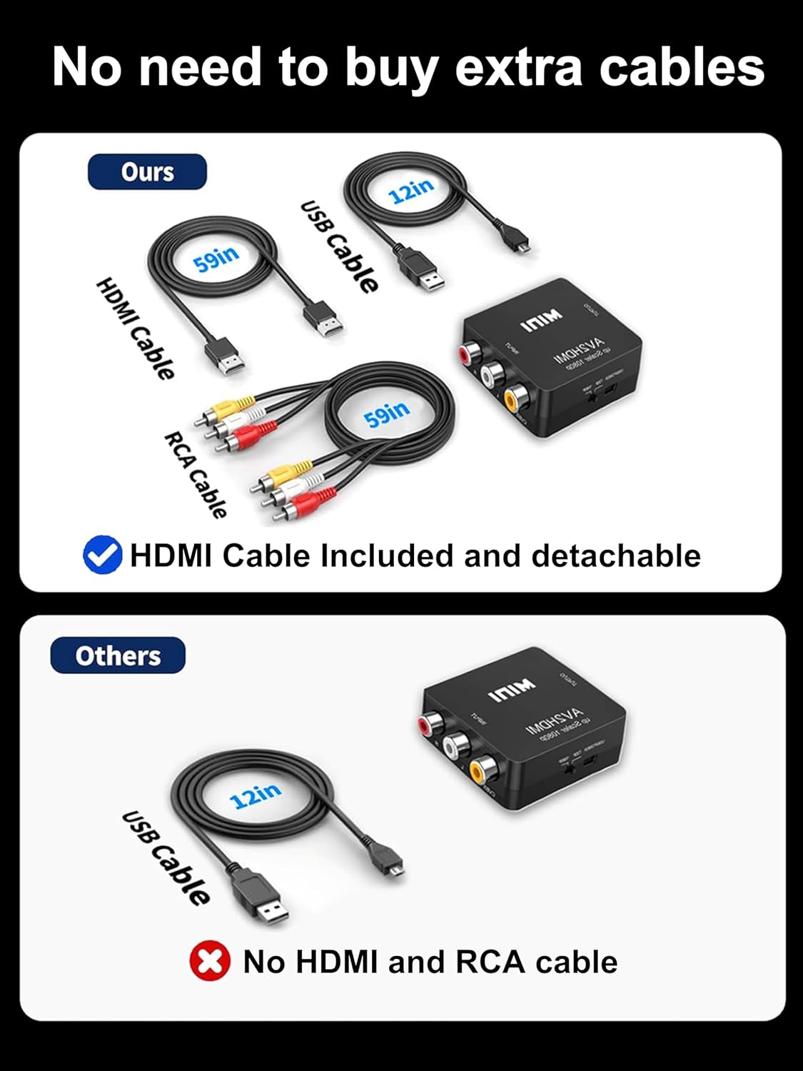 What You Get: 1* RCA to HDMI converter, 1* HDMI Cable, 1* RCA Cable,1*usb power cable(adapter not included), 1*User Manual, 24 months warranty quality guarantee, 24h friendly customer service and email support. Please ensure to connect this rca to hdmi converter to power source to make it work.
