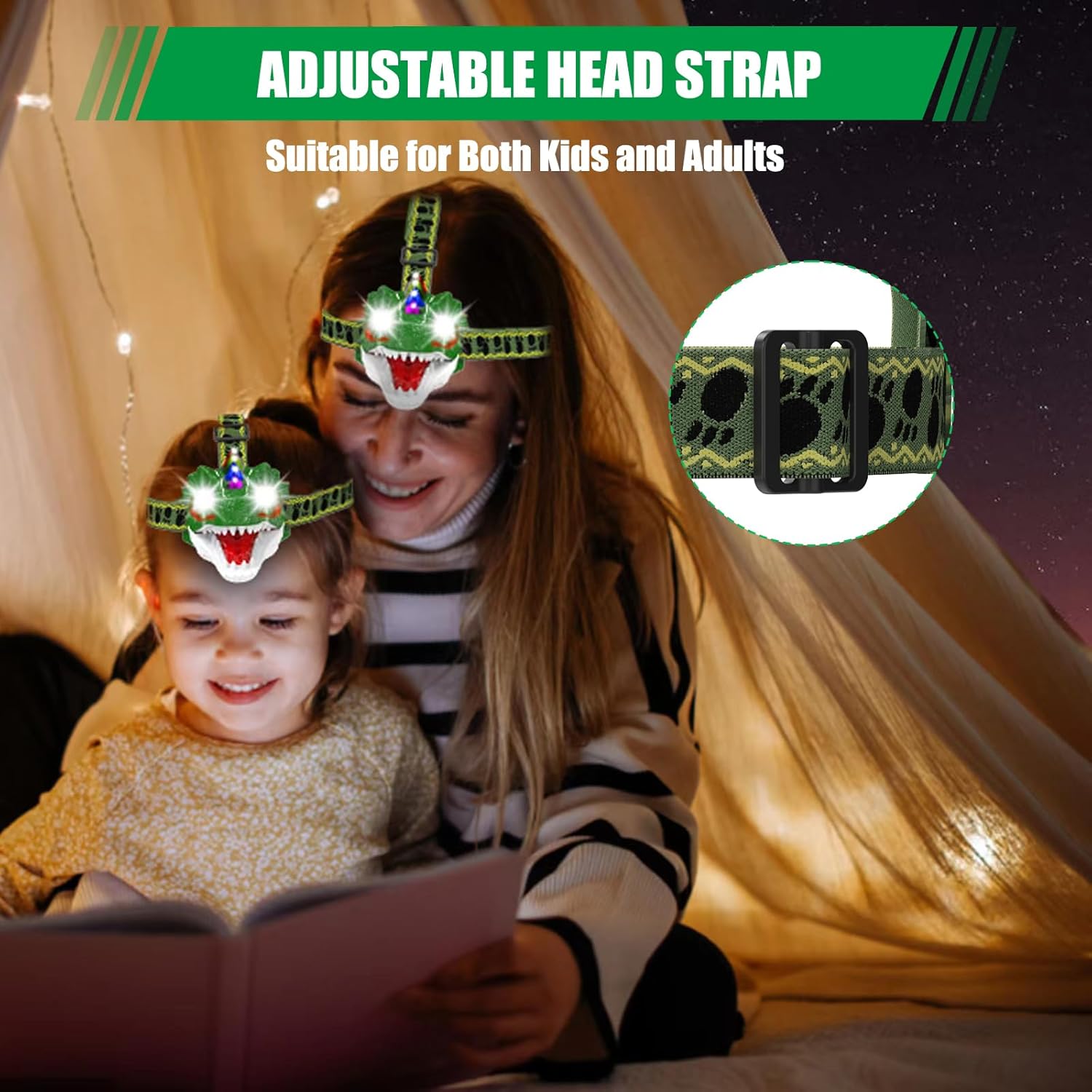 Ideal Dinosaur Headlamp Toy Gift: Dinosaur headlamp comes with a beautiful box can bring joy to kids as a gift for Christmas, Halloween, birthday gift or a game party. Must-have kit for kids nature exploration, camping tent. Plus, these little bright light can be visible to vehicles far away, especially keep kids safe at night.