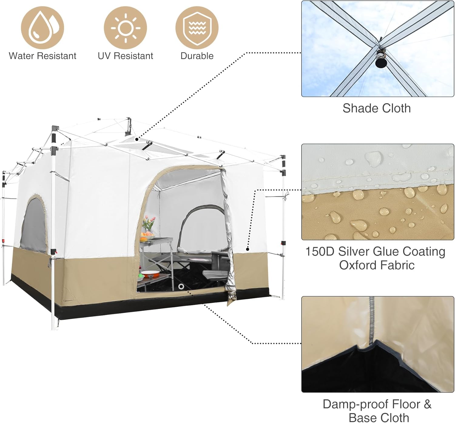 【Water-resistant & UV-resistant】This enclosed pop up canopy is made of durable 150D silver glue coating Oxford fabric, which is water-resistant and UV-resistant. At the same time, an additional shading cloth is added at the top to provide better shading effects. The bottom is damp-proof floor, which can ensure that you do not catch a cold while sleeping.