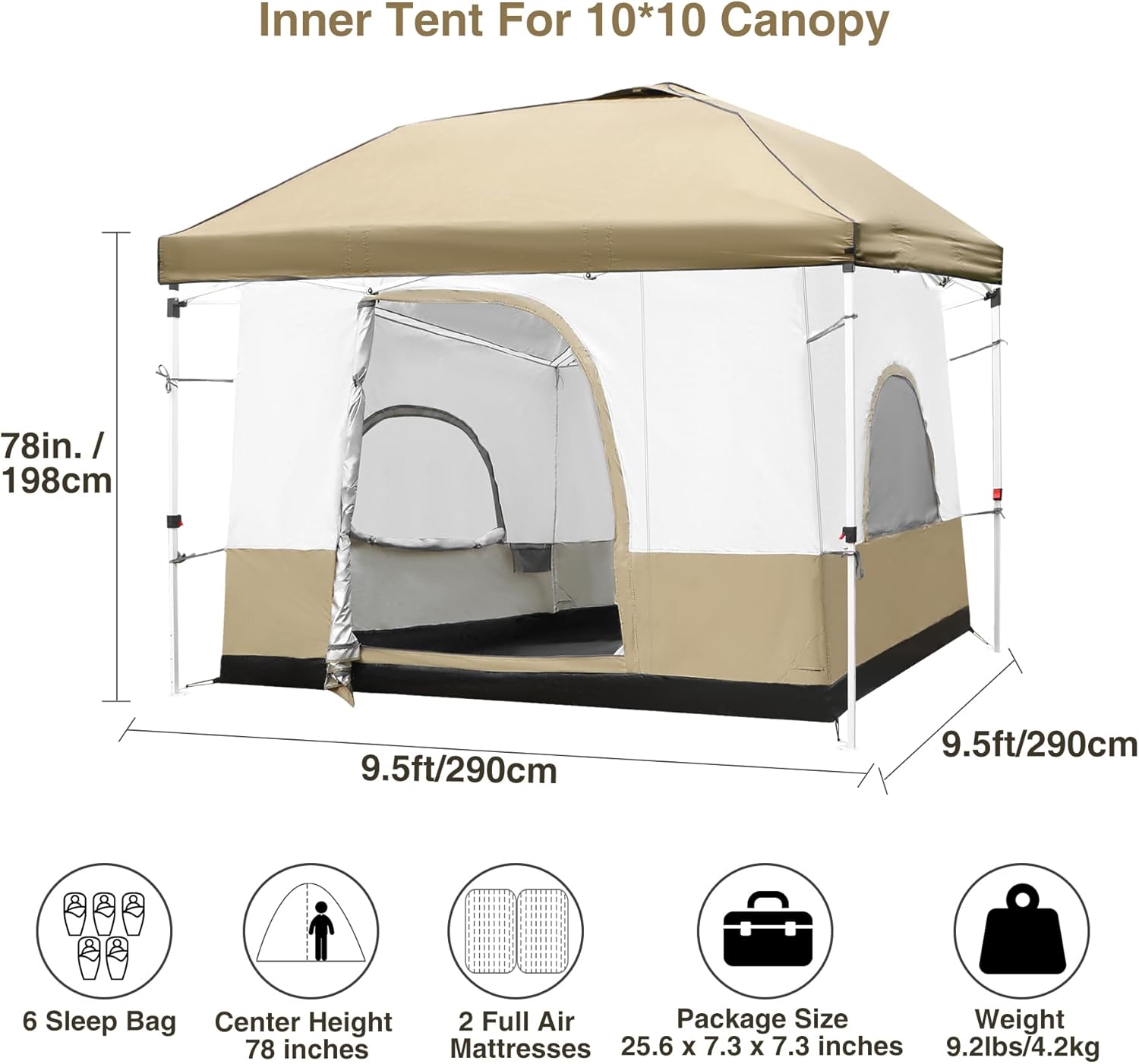 Dimension 9.5ft x 9.5ft x 78in (Center Height), 90.3 square feet, fit 6 sleeping bags or 2 air mattresses Material 150D Silver Glue Coating Oxford Fabric, water resistant Weight 9.2lbs/4.2kg Usage Scenarios Ideal for any camping trip, a great shelter for party, picnics, market stall or any outdoor events. Kindly Note 1. Only Camping Inner Tent, the canopy metal frame is NOT included in the package. 2. This standing room universally fits 10’x10’ft Canopy Tent with straight legs.