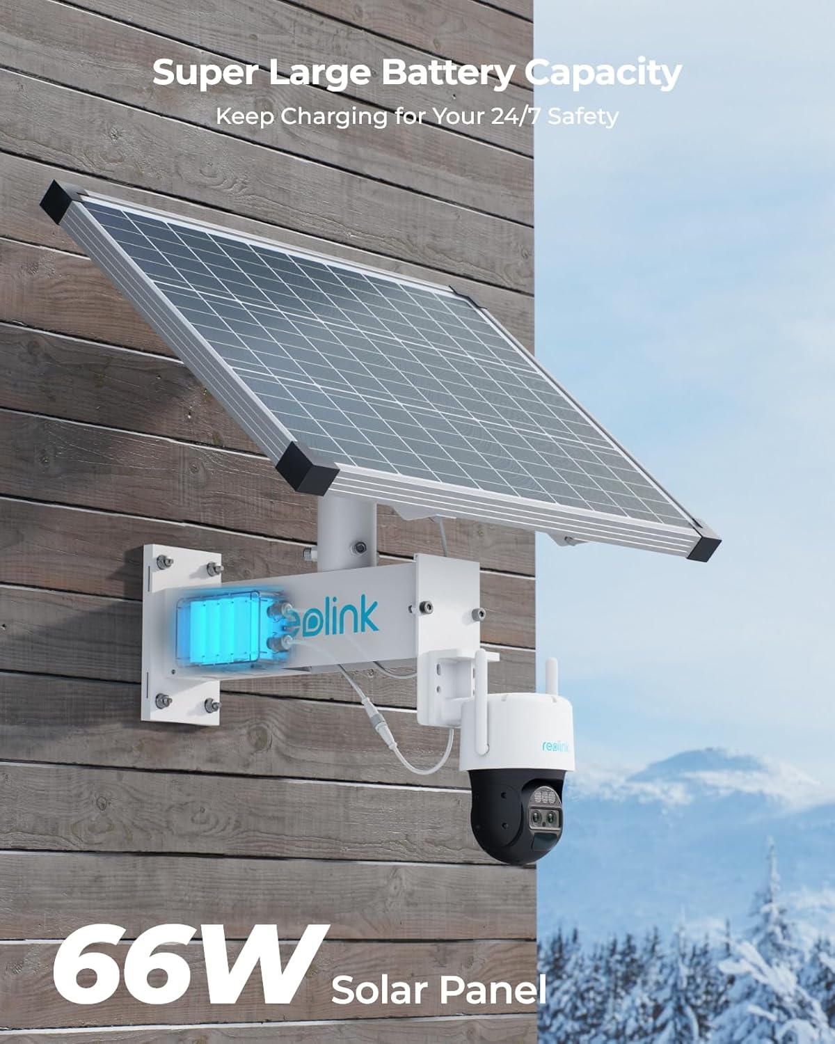66W SOLAR PANEL & Built-in Battery: An ultra-reliable surveillance solution for a place without WiFi or a power connection. 66W solar panel with a built-in battery can keep charging TrackMix LTE Plus even in cold weather. 24/7 non-stop recording is now possible for battery-powered cameras.
