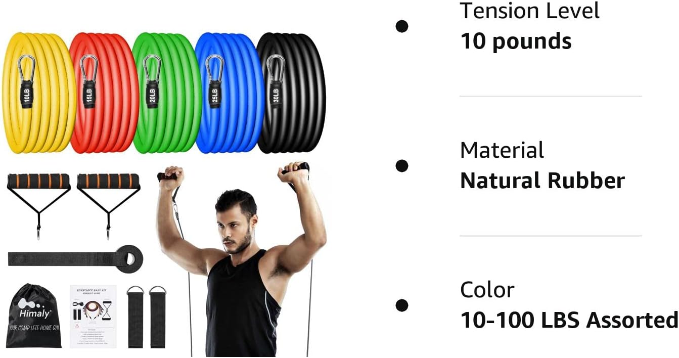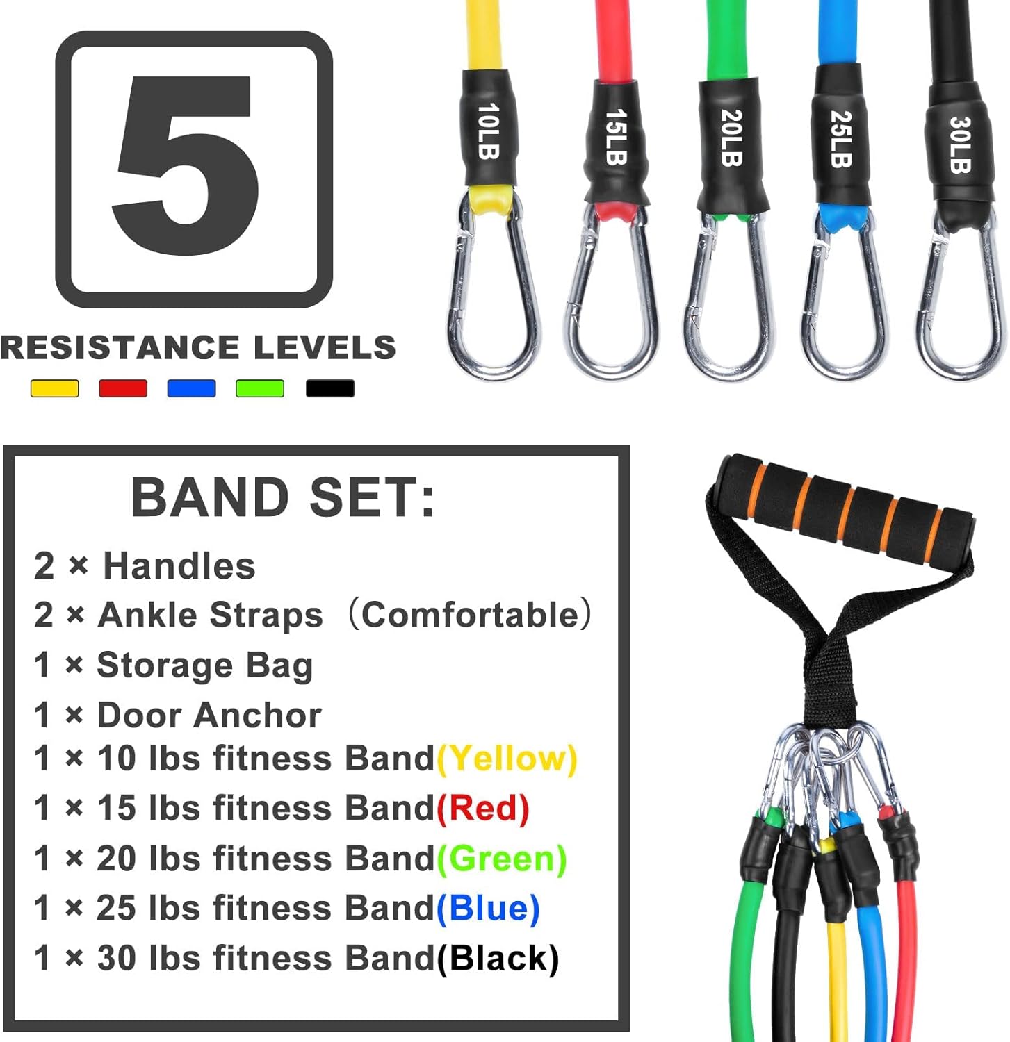 【Different Color】:Yellow (10 lbs), Red (15 lbs), Blue (20 lbs), Green (25 lbs), Black(30 lbs). All exercise bands can be used alone or stacked in any combination to a maximum equivalent of 100 lbs.