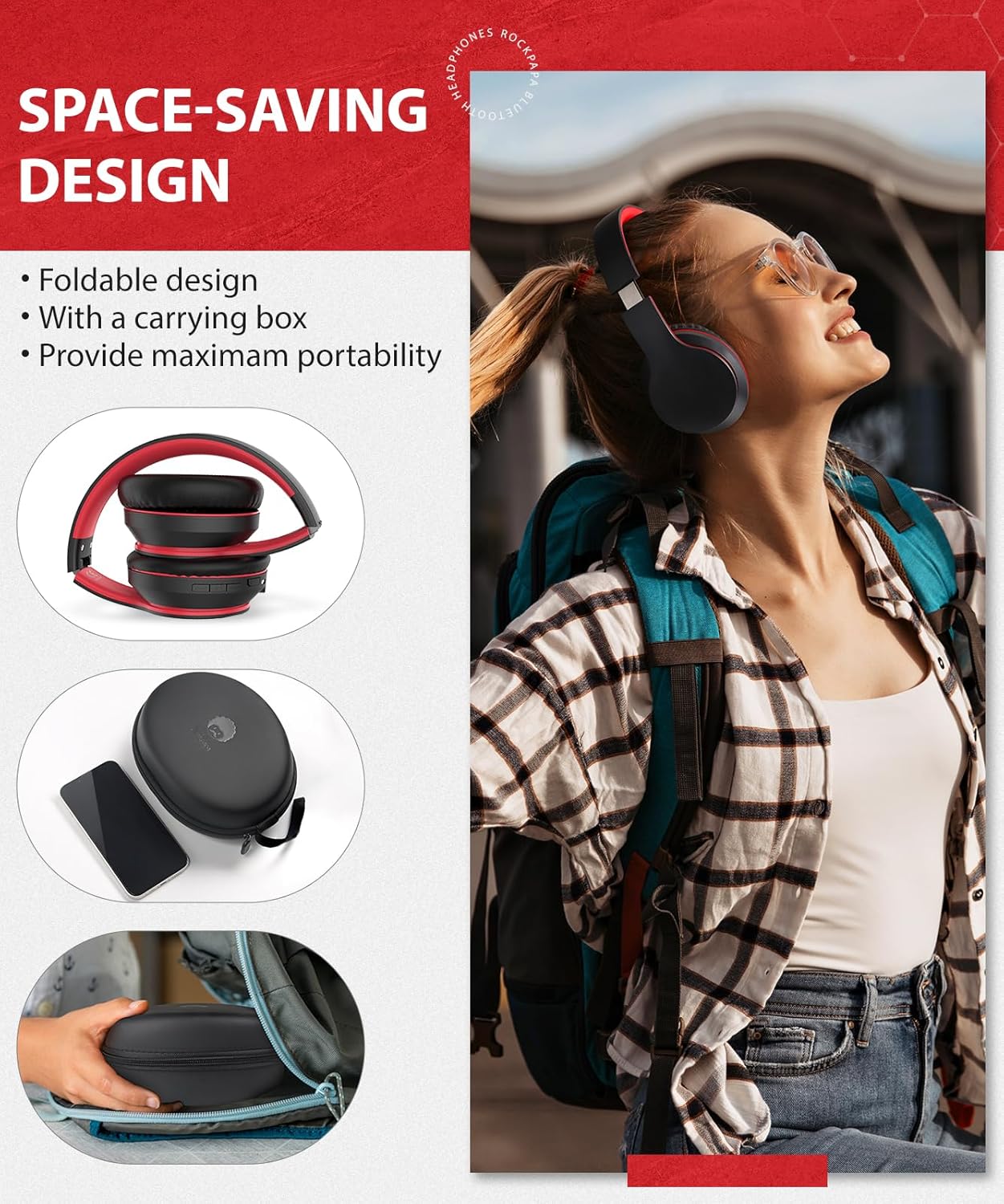 rockpapa E7 Over Ear Wireless Bluetooth Headphones with Mic Include Travel Case, Foldable Wired/Wireless Headphones with Microphone for Kids Childrens Boys Girls Teen Youth Adult Black Red