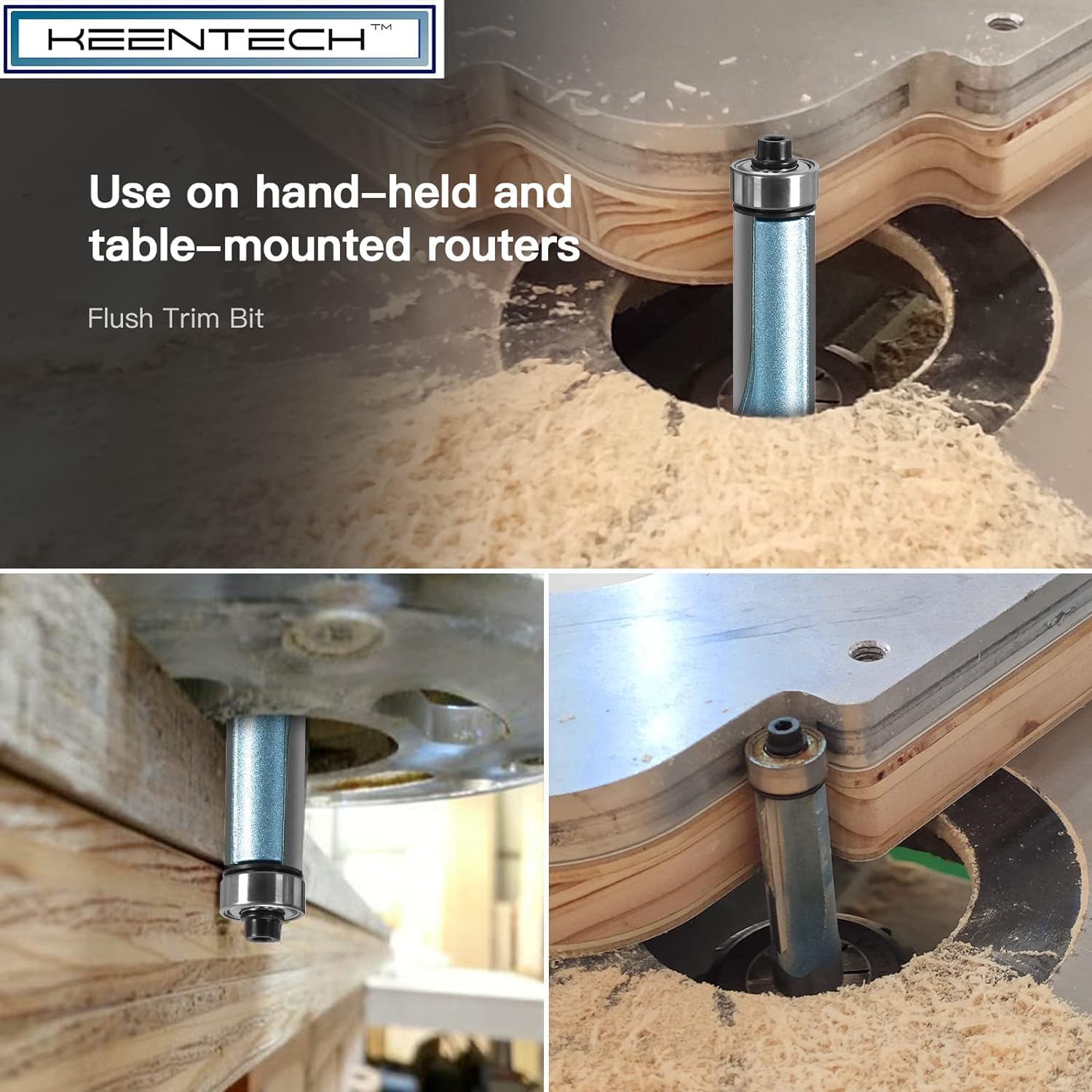 KEENTECH ROUTER BITS — This top & bottom bearing flush trim router bit is sized: 1/4 Inch Shank, 1/2 Inch Dutting Diameter, 1 Inch Cutting Depth, and 3-1/8″ Overall Length. We provide a wide range of sizes, catering to various woodworking needs, designed to deliver precision and reliability for all your cutting and trimming tasks.