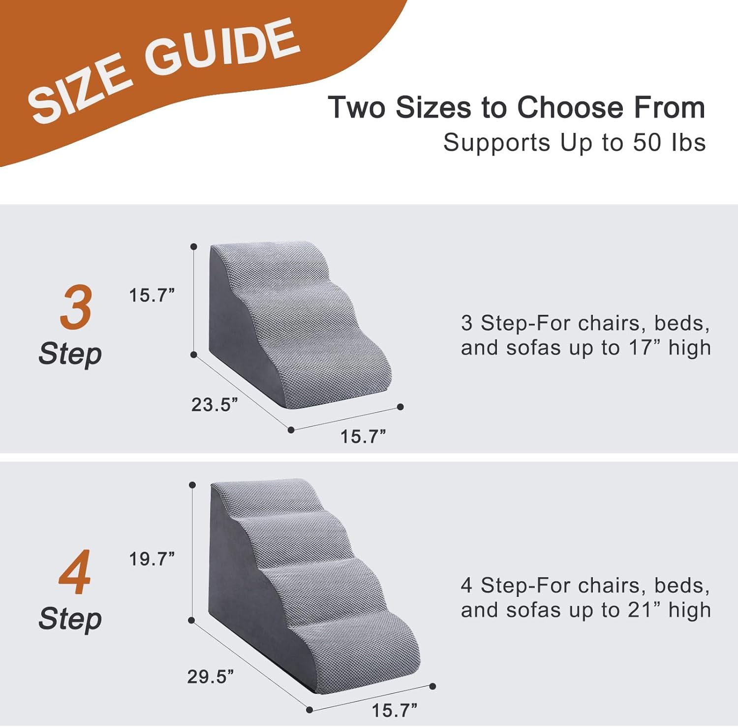 SAFETY & STURDY DOG STAIRS: Dog ramps for small dogs are constructed from high-density 30D foam, which has good recovery and is not easy to deform and collapse, providing excellent support for dogs and cats, safeguarding their joints, and offering maximum climbing comfort. The dog steps feature a non-slip bottom and lightweight sponge material, ensuring a safe climbing experience for pups, older dogs, or injured cats, whether indoors or outdoors